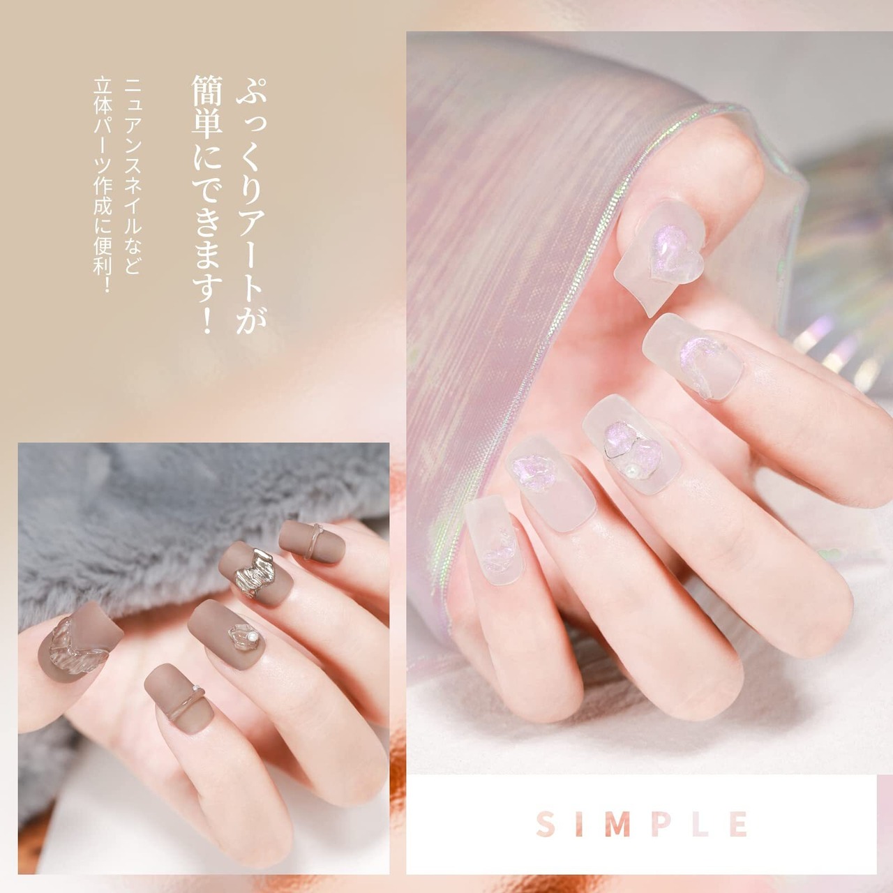 【万能な粘土ジェル】粘土ジェルは高めの透明度、流れにくい固めの粘度で手に粘りられません。ネイルチップ固定用ジェルとしても適用で、初心者さんでも扱いやすいです。ニュアンスネイルなど立体パーツ作成に便利、グミのようにこねて使えるジェルネイルです。