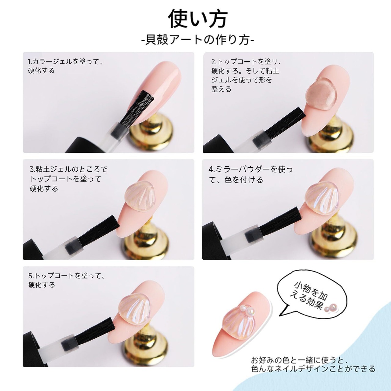 ご注意:手でこねる際は、アレルギー防止の為、使う前に皮膚テストを行ってください。厚みをだすと硬化の際に熱を感じることがあります。硬化時間は目安であり、ご使用されるライトや塗布量により異なります。ヒント:ノンワイプではありません