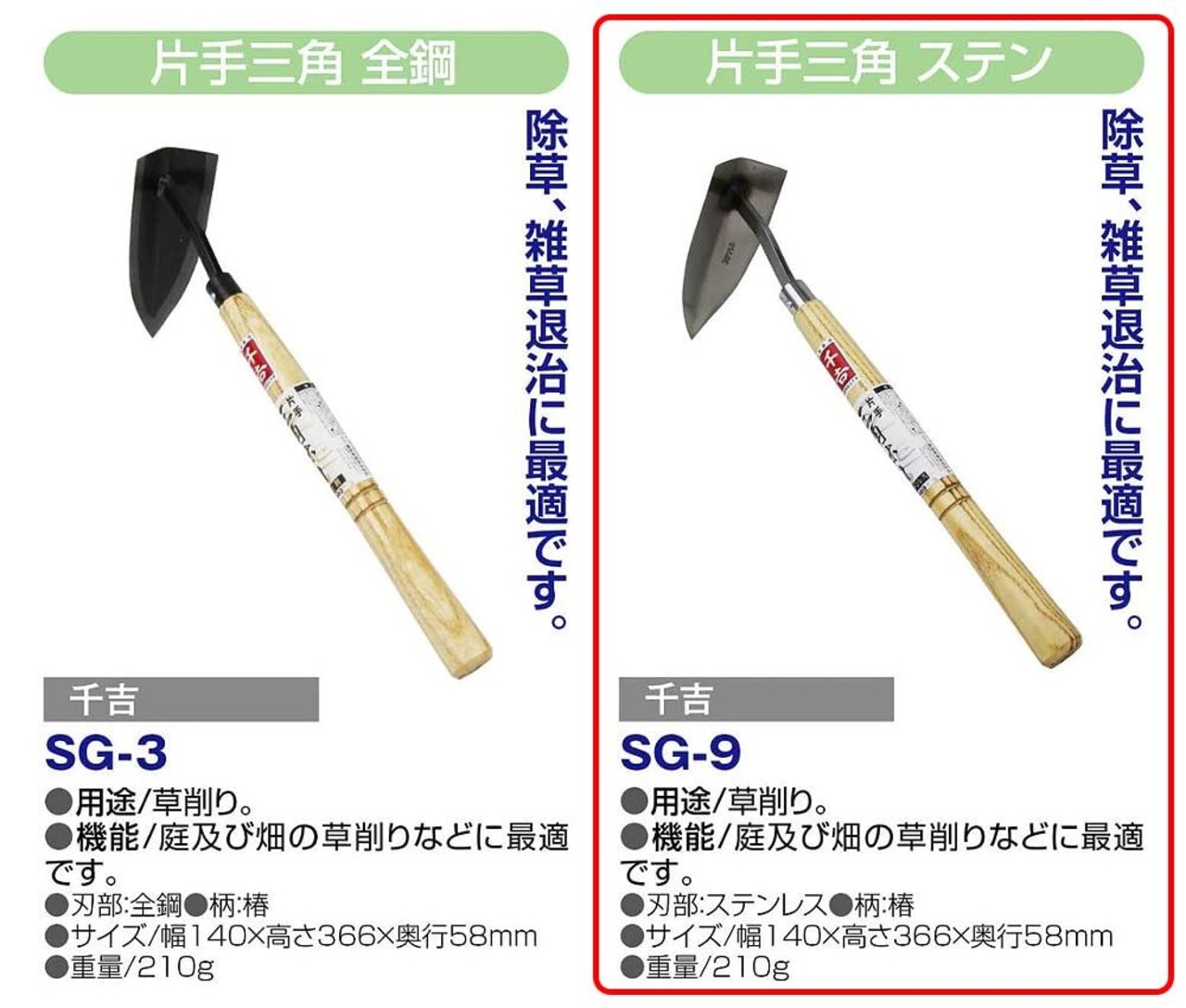 「千吉 片手三角 ステンレス SG-9」は、あなたの園芸作業をよりスムーズにするために設計された高性能なツールです!ステンレス製の刃が鋭く、耐久性と使いやすさを兼ね備えています。