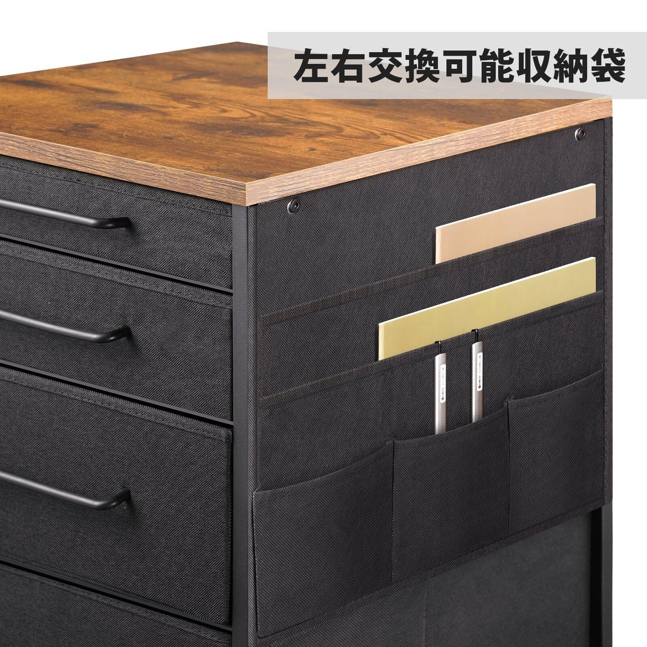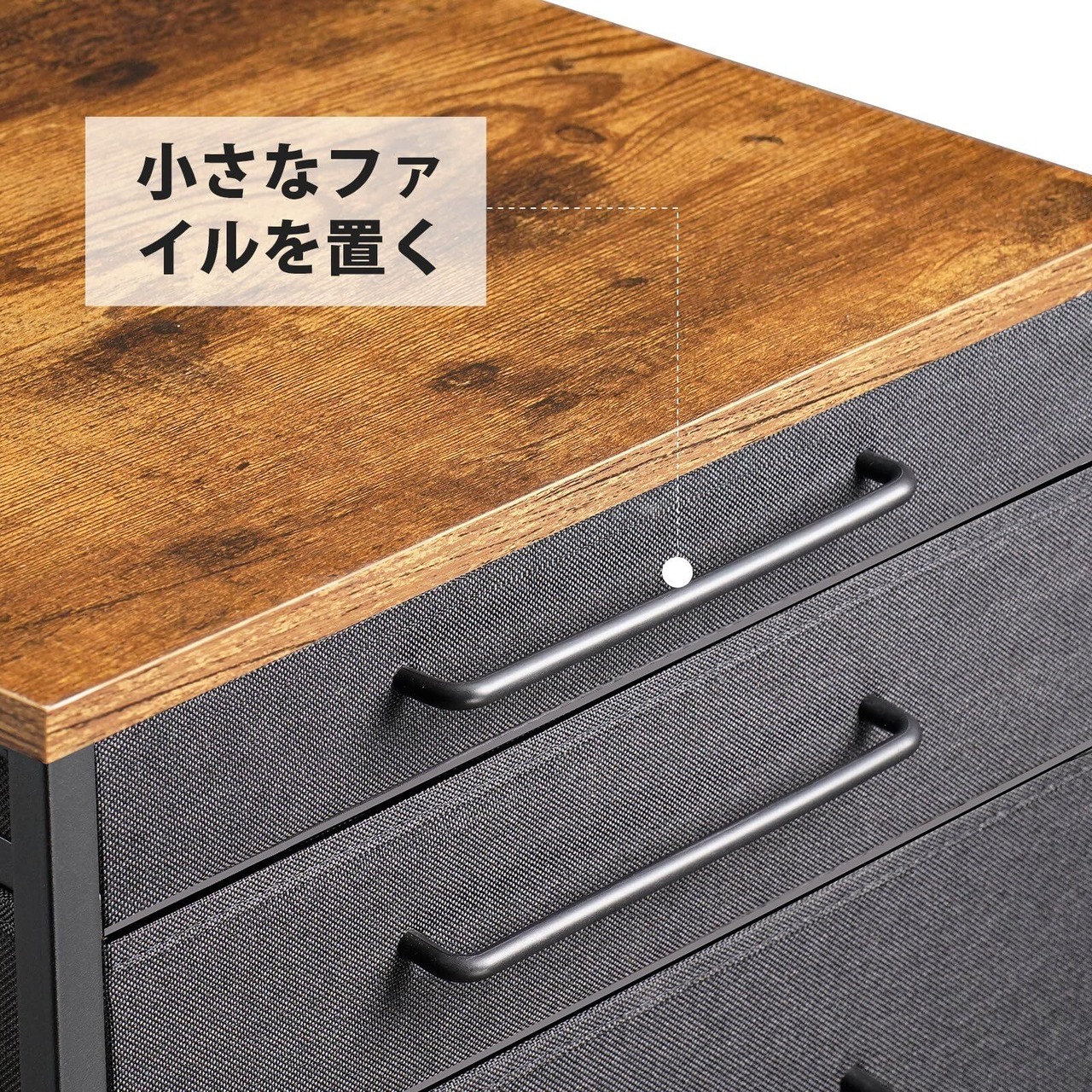 【温かみのあるデザイン】布制のキャビネットに金属のシンプルな取っ手と質感のある木制の天板を組み合わせました。シンプルなデザインと落ち着いた色合いで、単体の使用でも違和感なくインテリアになじみます。オフィスや寝室、リビングなど、さまざまな場所で使用できます。