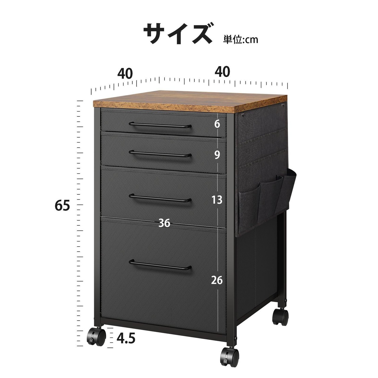 【在庫セール】YeTom デスクワゴン キャビネット サイドチェスト オフィスワゴン 布製 袖机 サイドワゴン 4段 A4対応 大容量 キャスター付き デスク下収納 幅400*奥行400*高さ650mm 柜子 ビンテージ+黒い引き出し
