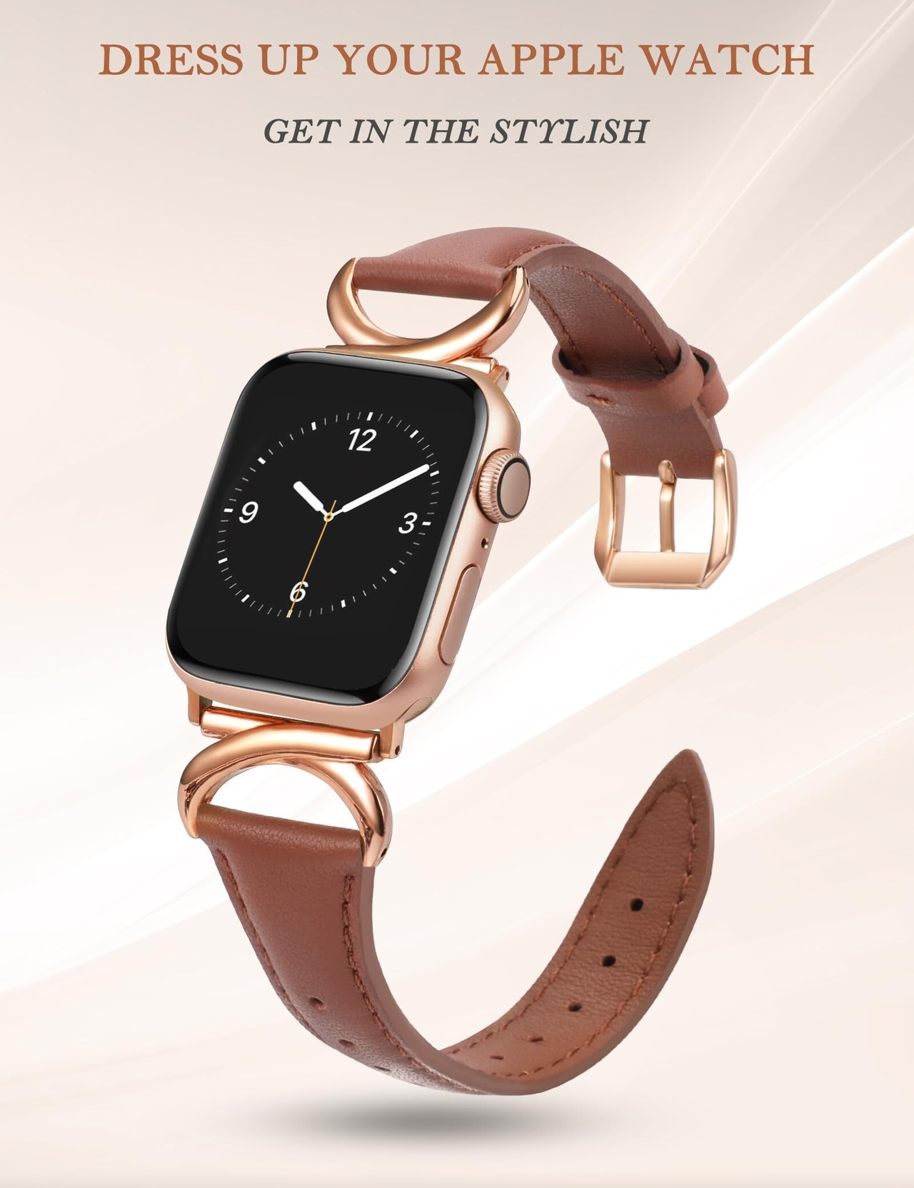 このレザーバンドは、滑らかなブラウンとエレガントなローズゴールドの組み合わせが特徴です。毎日のカジュアルスタイルから、特別なイベントにまで幅広くお使いいただけます。シンプルでありながらモダンな印象を与えるデザインです。