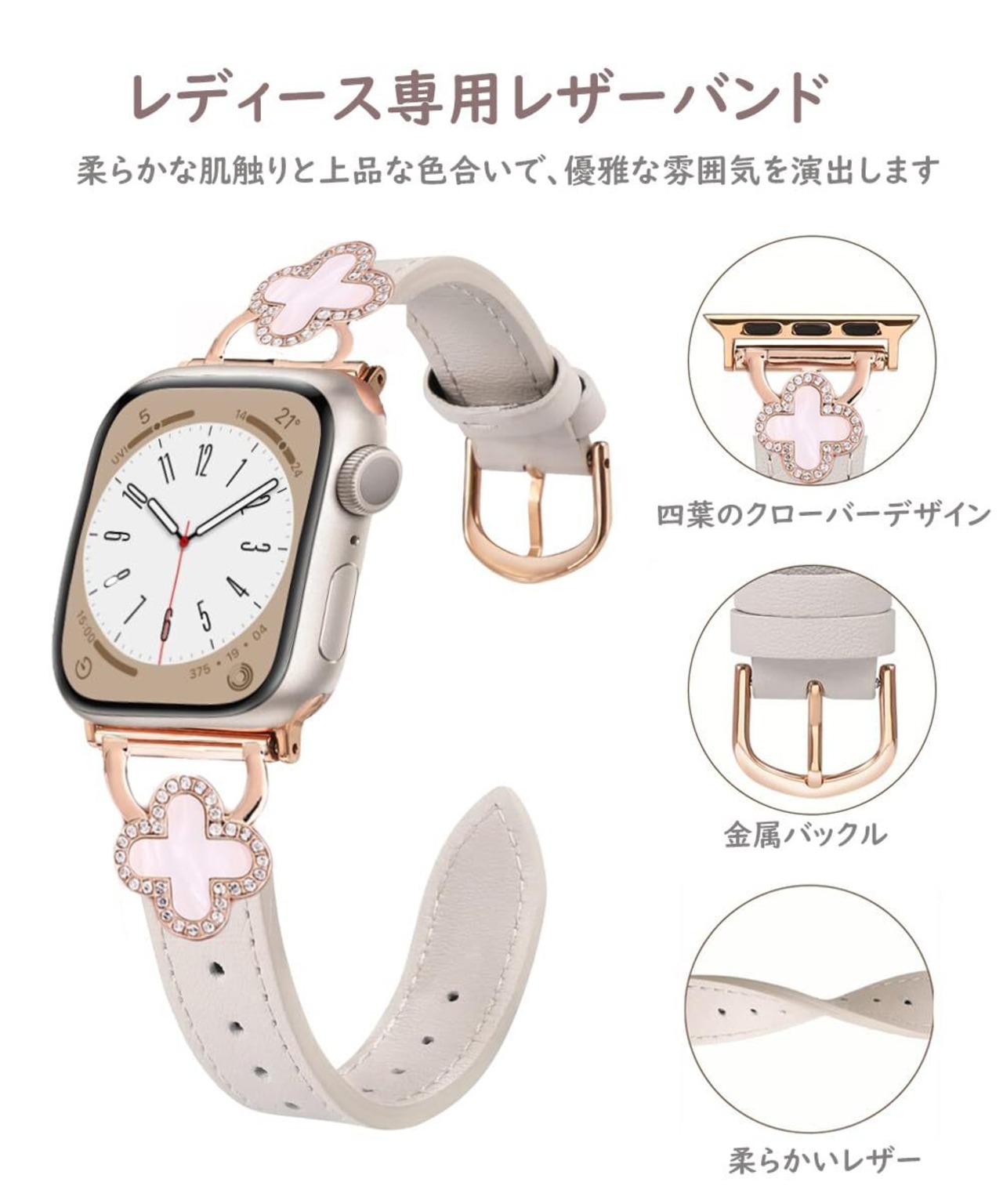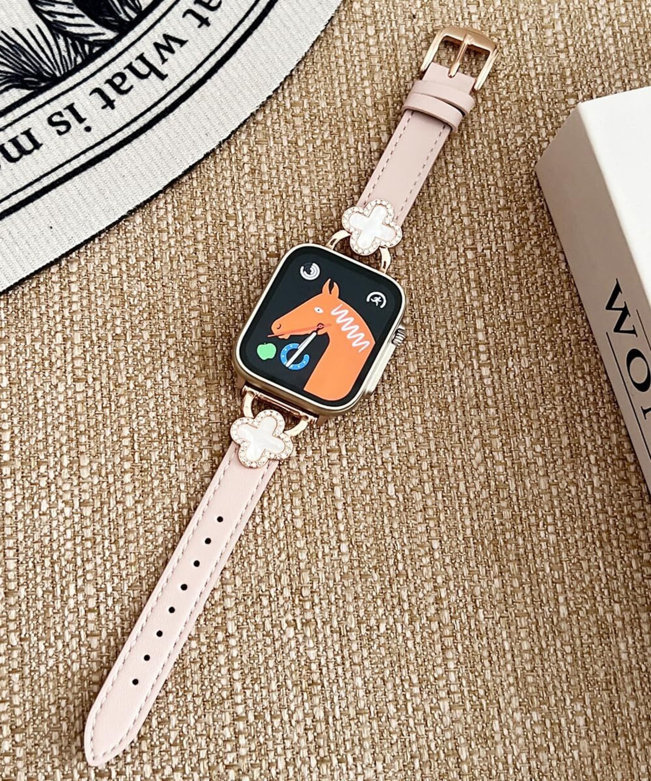 【在庫セール】コンパチブル Apple Watch バンド 本革 レディース アップルウォッチ Ultra2/Ultra/Series10/9/8/7/6/5/4/3/2/1/SE レザー交換ベルト 四つ葉のクローバー キラキラ 可愛い アップルウォッチ バンド 女性向け iWatch 38mm 40mm 41mm 42mm 44mm 45mm 49mmに対応 ( ピンク,46/45/44/42mm(series3の42mm))