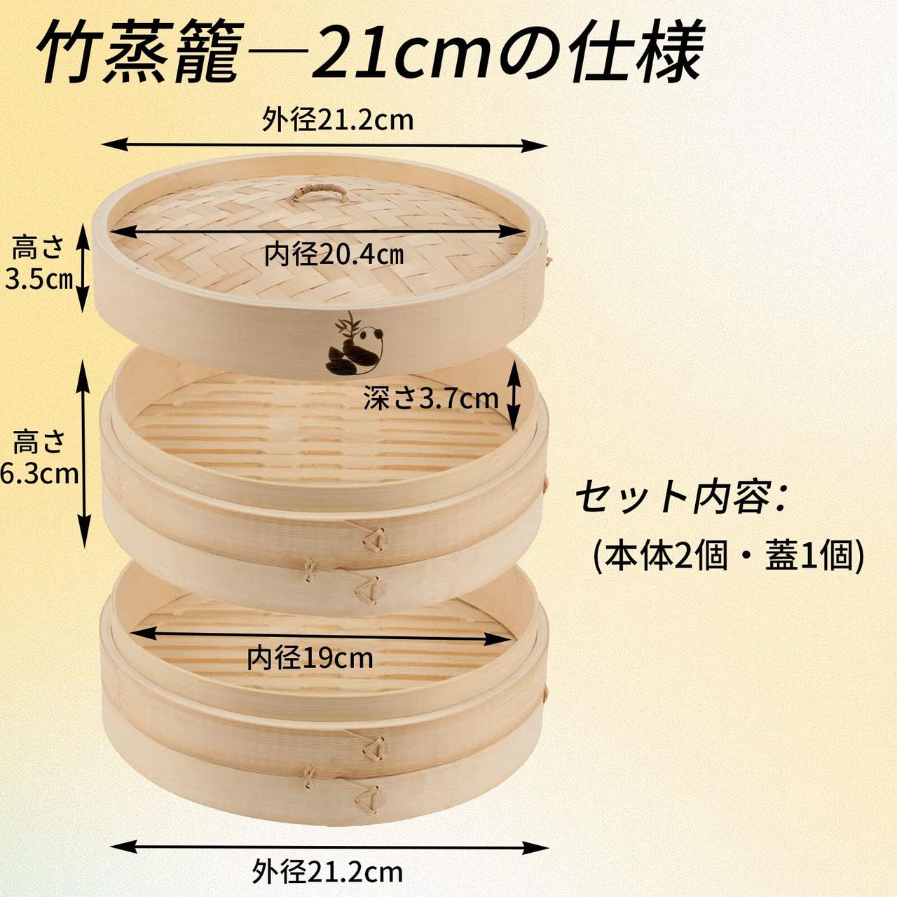 桜花直郵 竹セイロ 中華せいろ 直径21cm 本体2個・蓋1個セット せいろ蒸し器家庭用 業務用蒸篭 蒸し饅頭 1人用 耐熱耐久 水洗い可能 繰り返し使用 (竹セイロ直径21cm)