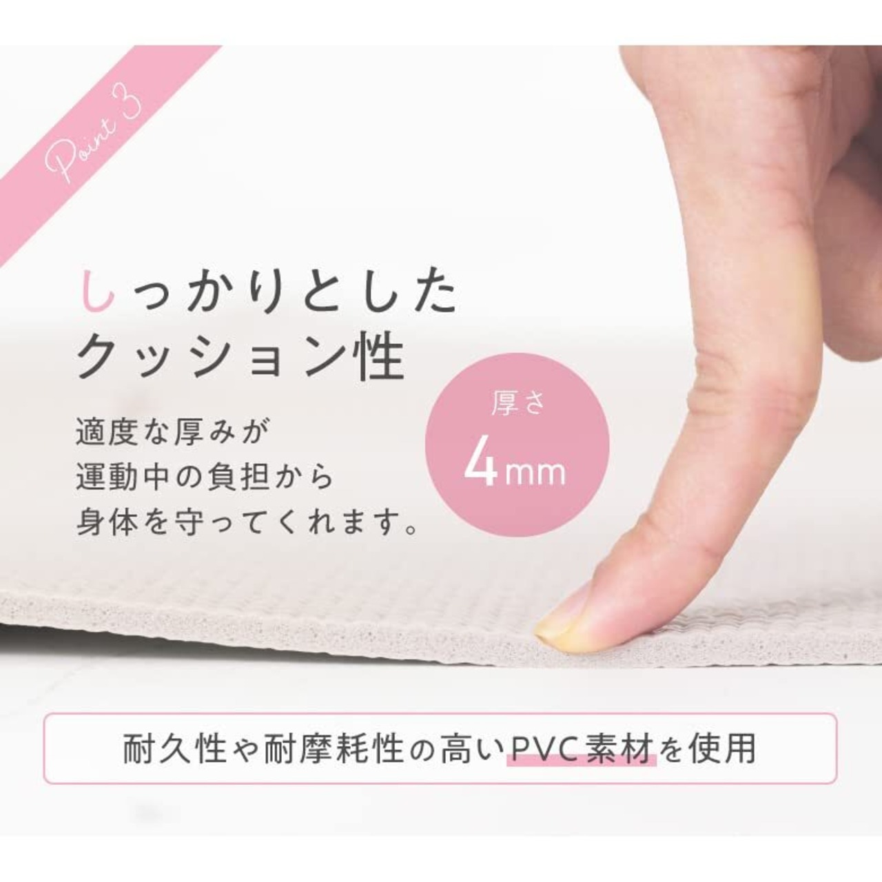 【身体を守る安心の厚み】厚さ4mmのしっかりとしたクッション性で、寝転がっての運動やアクティブな動きでも身体への負担を軽減するため安心して運動できます。