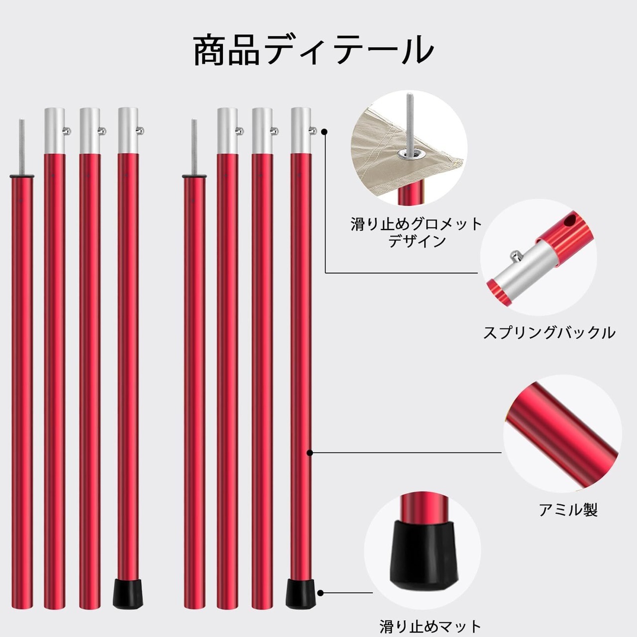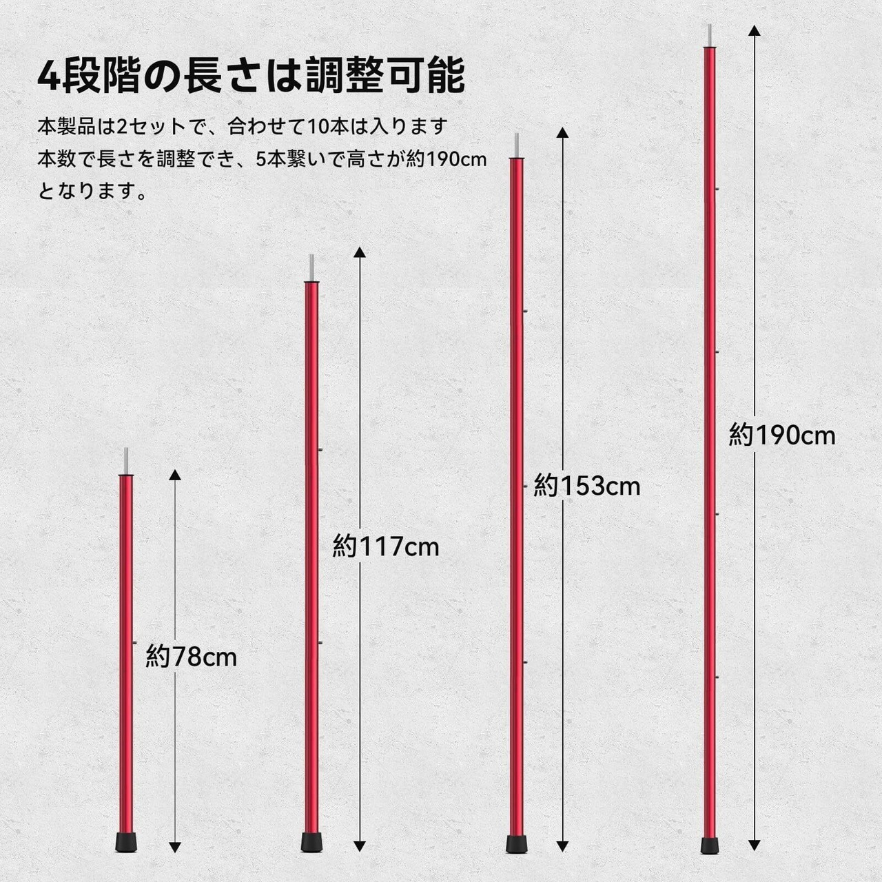 【商品仕様】本製品はテントやキャノピーを張る際に役に立つポールです。10本は入り、5本繋いで高さは約190cmとなります。収納サイズが約45cm×20cmとなります。重さは1本あたり76gで、全部10本は約760gとなります。パッケージ内容:10本+収納袋 カラー:レッド