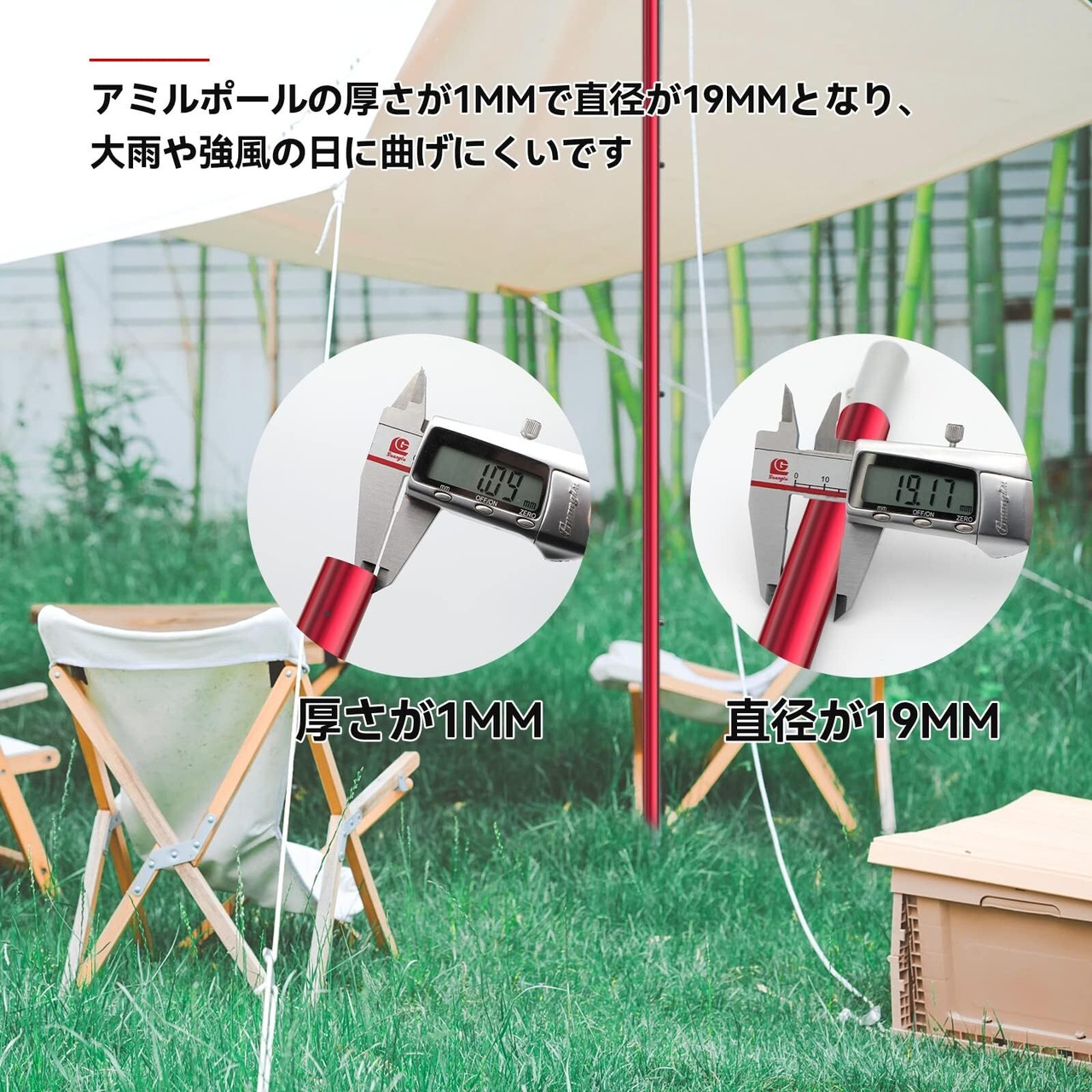 直径19mmの高強度アミル製のポールは、驚くべき耐久性を誇ります。軽量でありながら、しっかりとした支持力を持っているため、安心してテントやタープを支えることができます。