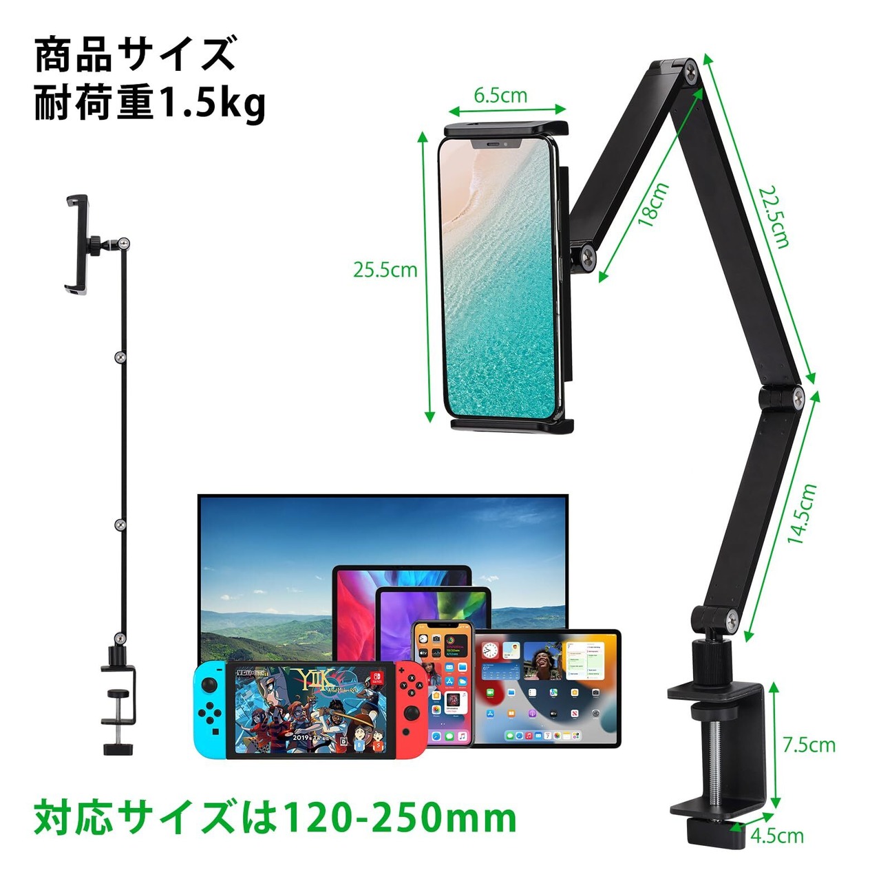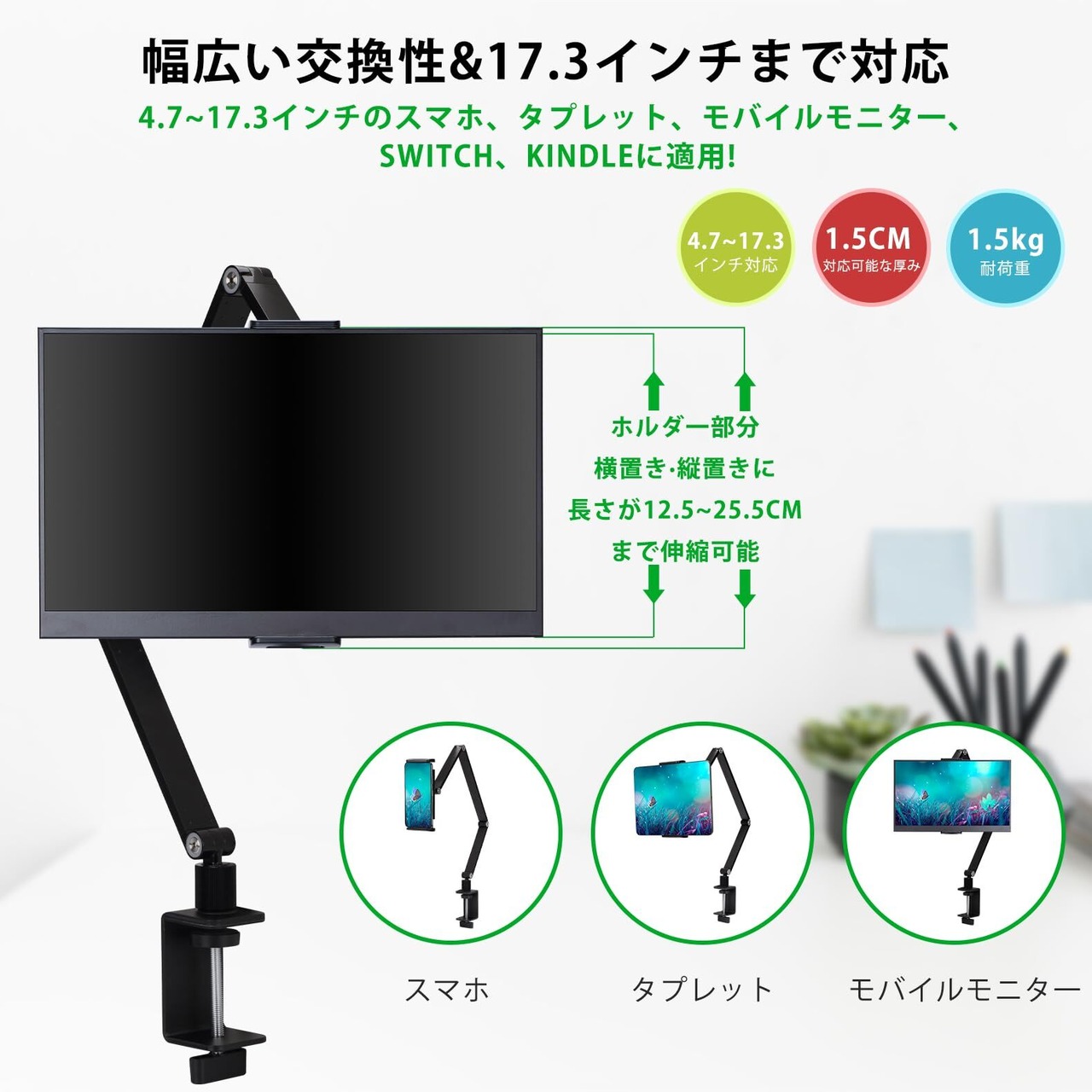 ホルダー部の長さは12.5~25.5㎝まで伸縮、ほとんどの4.7-17.3インチのスマホ、タブレット、モバイルモニターに対応できます。耐荷重は1.5kgです,同類製品における最大耐荷重。
