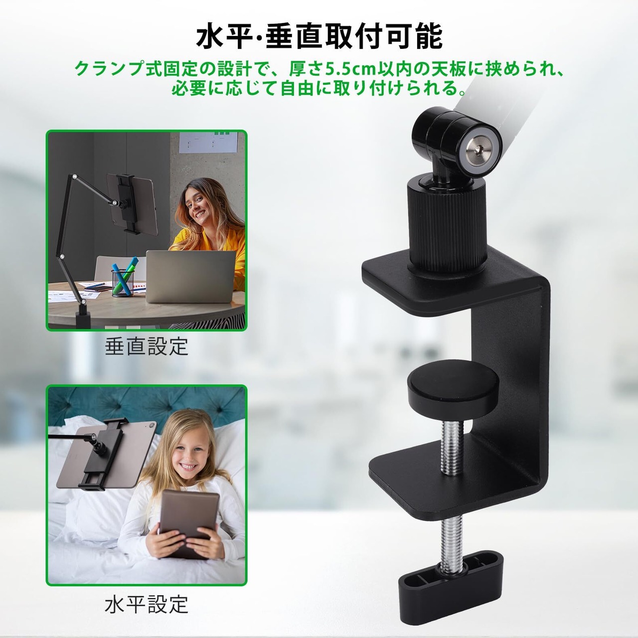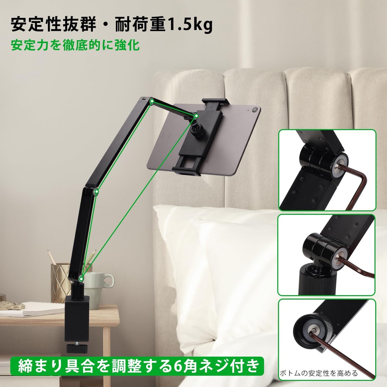 【6つの回れる関節・自由伸縮】6つの関節を採用された2023最新のクランプ式タブレットスタンドとして、お好みの向き、高さを調節することができます。どんなに曲げでも安心してご利用いただけます。3段式のアルミニウムアームを備えるので、一般的なipadホルダーよりも一層便利になります。折り畳み式で、使わない時には収納と持ち運びが便利です。(ご注意:長時間の使用で台座の360度回転関節を何回に回転させると揺れる場合があります。解決方法:台座とアームを外して、付属な六角レンチでアーム側土座連節内部のネジを締めると揺れ現象が解消できます。)