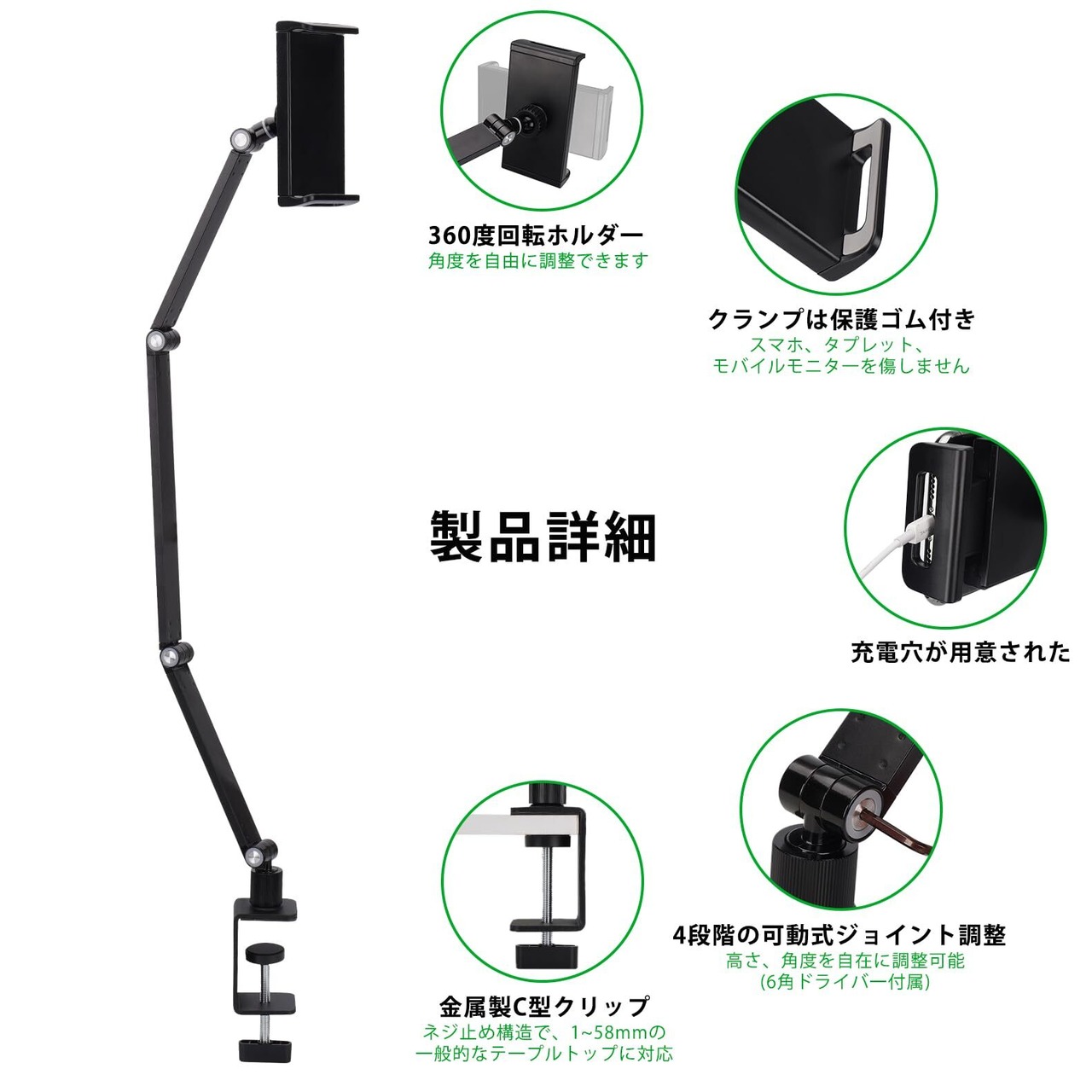 【クランプ式でかんたん設置】クランプ対応の厚みは1~6cmです。道具不要でも、取り付け簡単にできます。高さや角度を自在に変えられる3段階で270度で角度調整できるアームと360度回転するボール型のジョイントより、スマホやタブレット画面の向きを好きな体勢で、見やすい角度に合わせられて自在に調整できます。注意:モバイルモニターやその他の重いデバイスを使用する場合は、サイドネジを調整して、アームの負荷力を高める必要があります。