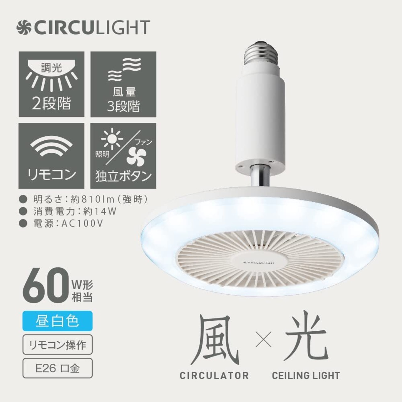 【現行モデルは風量アップ】ドウシシャ サーキュライト ソケットシリーズ E26モデル 昼白色 60W相当 風量3段階 リモコン付き ホワイト