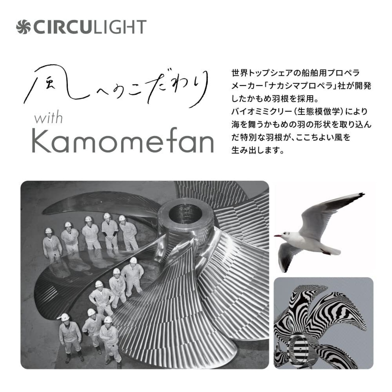 スイング機能搭載、Kamomefanを採用した「簡単取り付け」のシーリングシリーズ。ライトをつけると爽やかな風が吹いた。引掛シーリングに簡単取付ネジ留め不要。