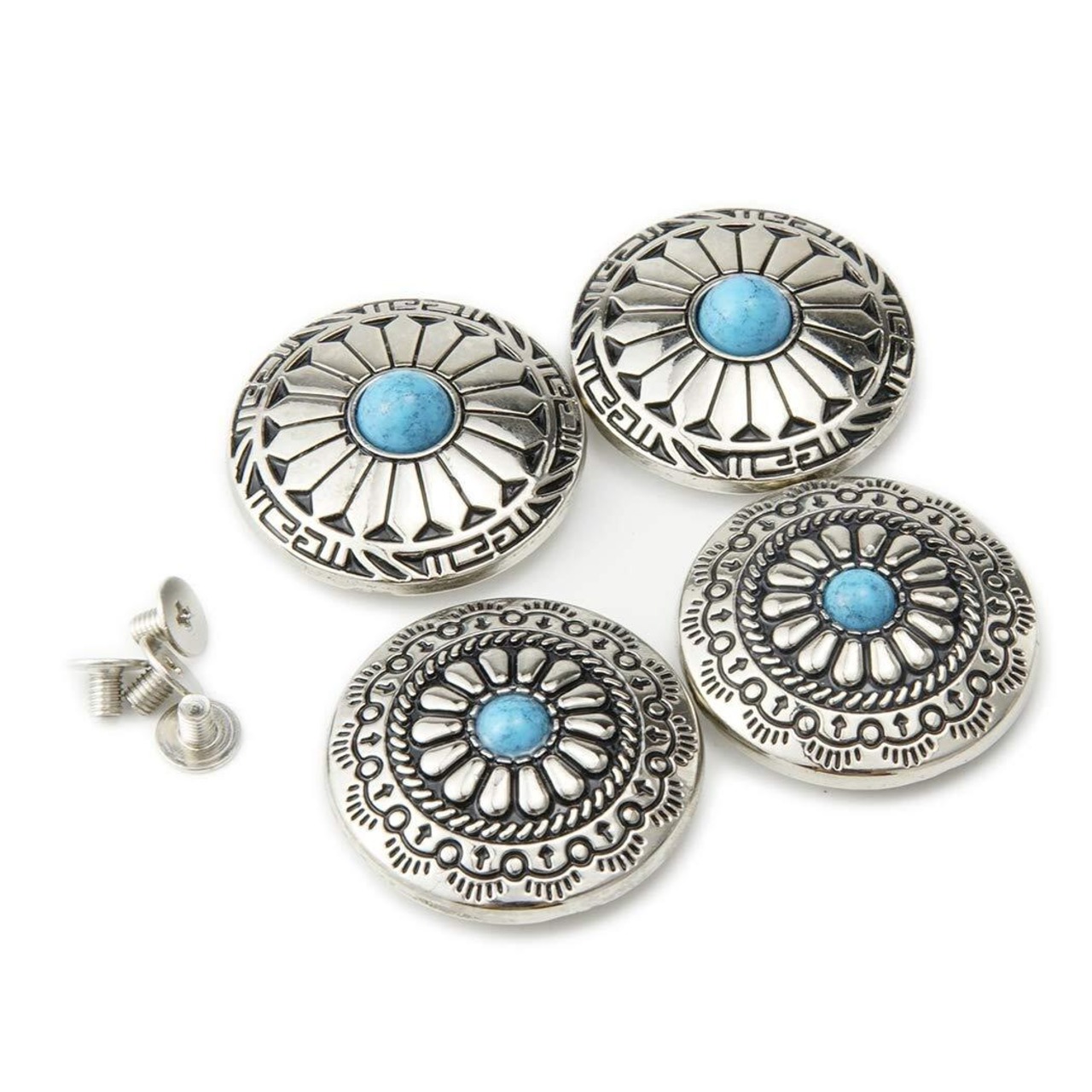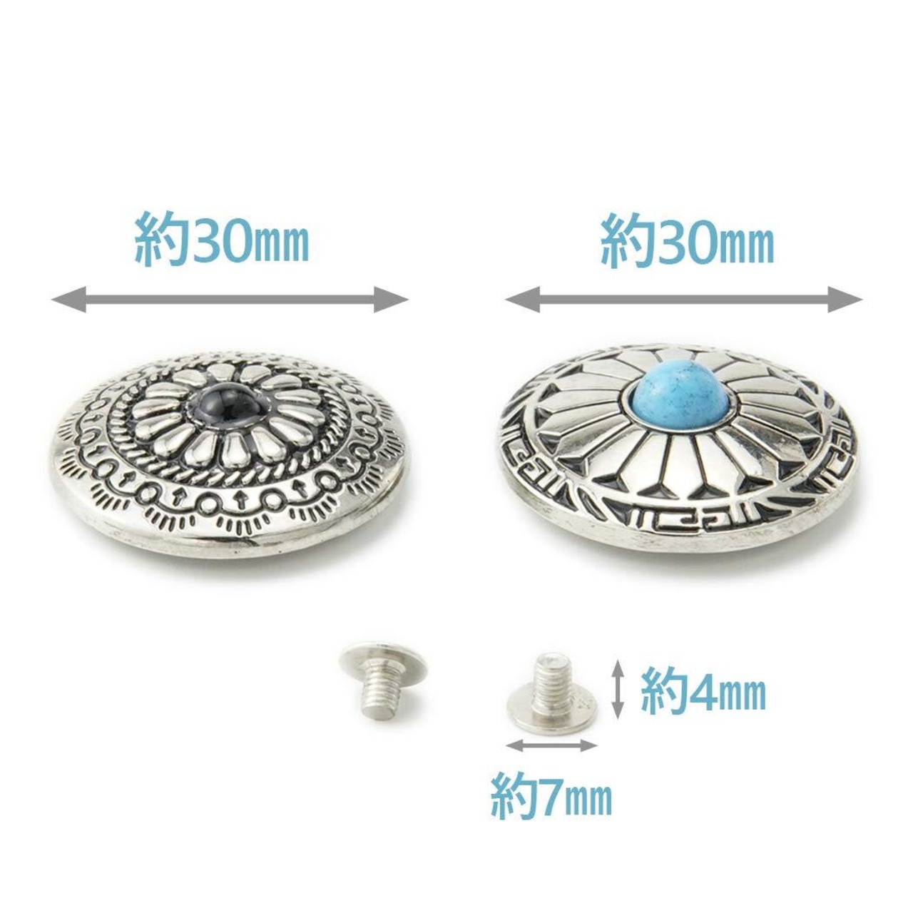 コンチョのサイズ:直径約30mm(画像にご参考ください) カラー:ターコイズブルー・シルバー仕上げ 材質:合金