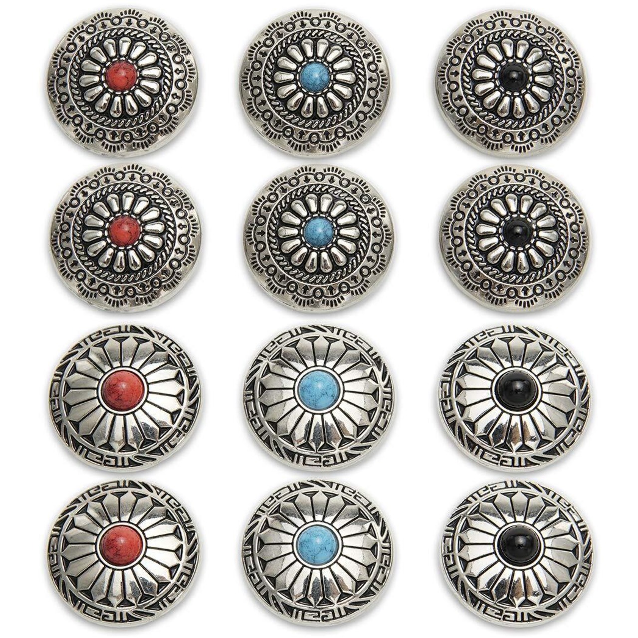 「コンチョ ボタン シルバー ターコイズ」は、ハンドメイド商品やクラフト作品の仕上げに最適なアイテムです!全12個セットで、お好きなデザインに合わせて様々な使い方ができます。