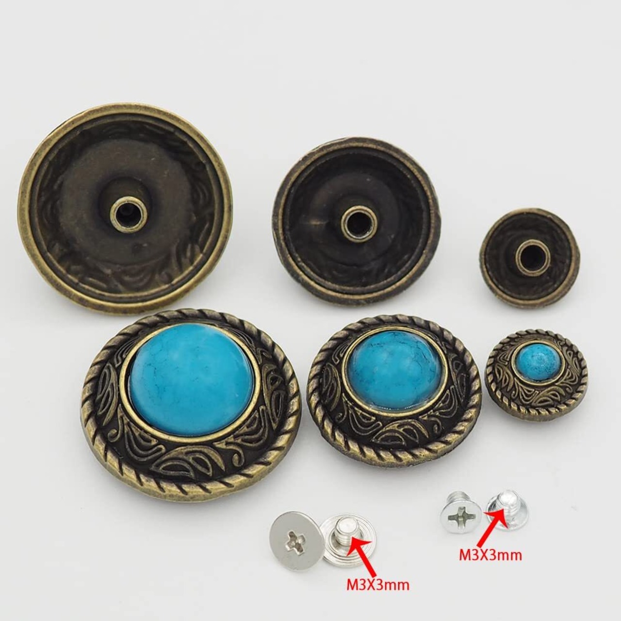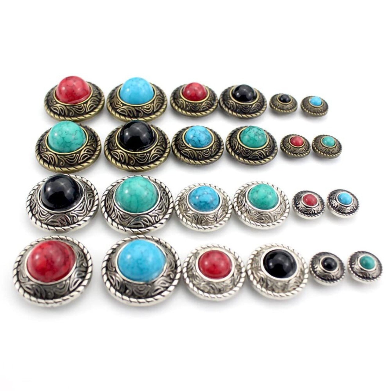 【ボタンの材質】:合金。サイズ:直径約12mmx4pcs。サイズ:直径約20mmx4pcs。サイズ:直径約25mmx4pcs。ターコイズカラー:ブロンズ仕上げ(ブルー,グリーン,レッド,ブラック),入数:ターコイズコンチョボタンの12個セットです。留め具として、ネジを24個付属します。