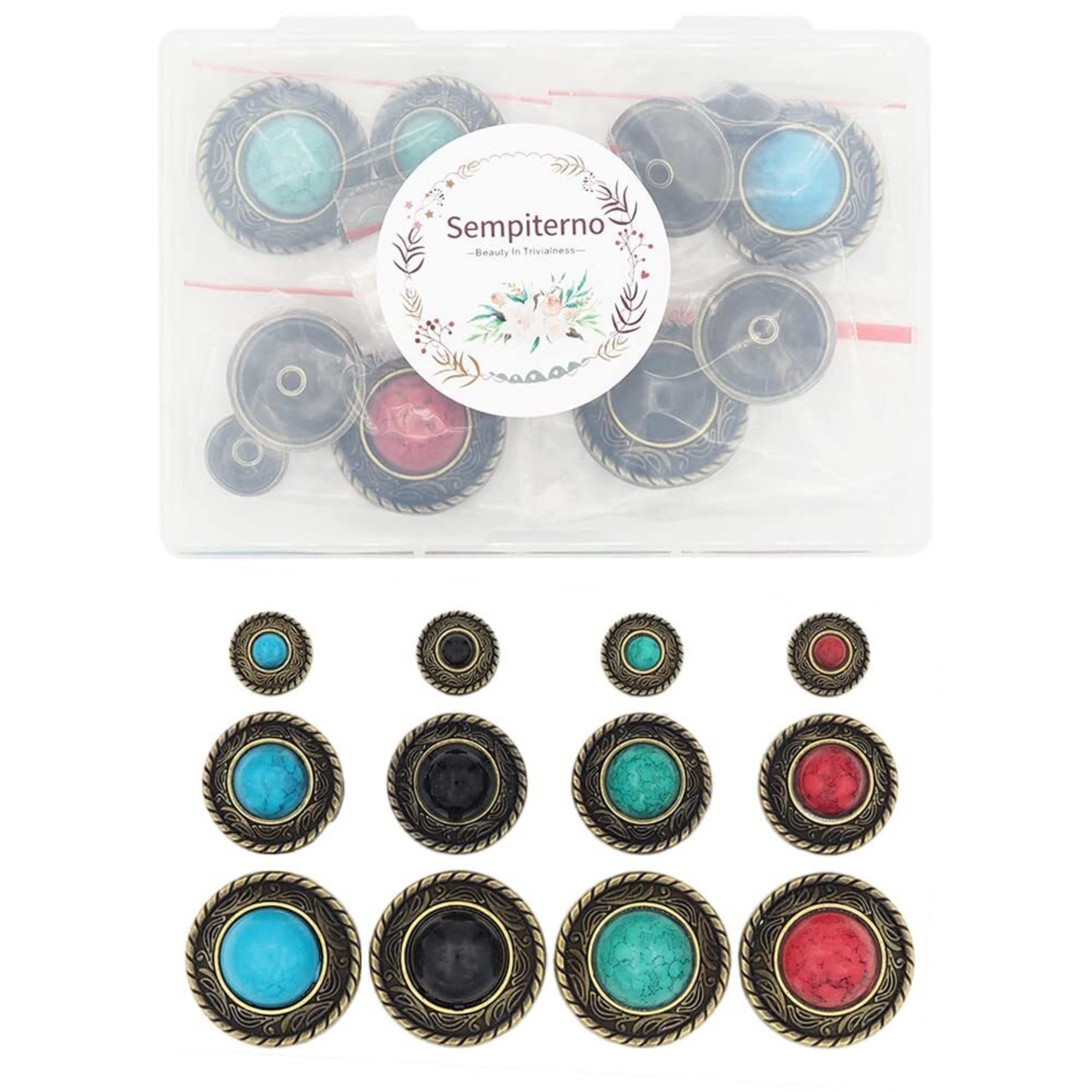 「sempiterno コンチョ ボタン」は、ハンドメイドやレザークラフトに欠かせないアイテムです!12個セットで、さまざまなサイズをお楽しみいただけます。