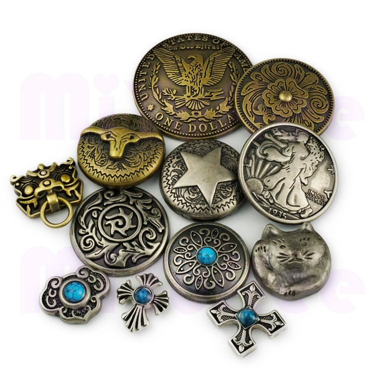 【在庫セール】コンチョ ボタン 12個セット ねじ式 アンティーク シルバー 金古美 15mm~38mm ターコイズ 唐草 クロス フラワー レザークラフト 財布 手芸