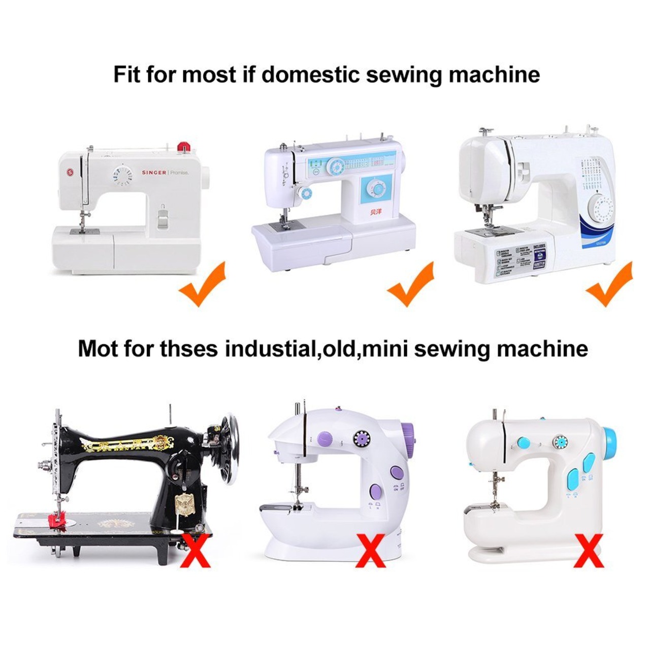 【適用機種】:ほぼすべての低ハンドルミシンとほとんどの家庭用ミシンに適しています。ラザー、ジャノメ、シンガー、JUKI、エルナ、蛇の目/新ホーム、ペースセッター、ジューキ、パーフ、バイキングなどに適合しています。古い家庭用ミシン、ミニミシン、工業用ミシン、ハイグレードミシン、チルトハンドルミシンには適していません。