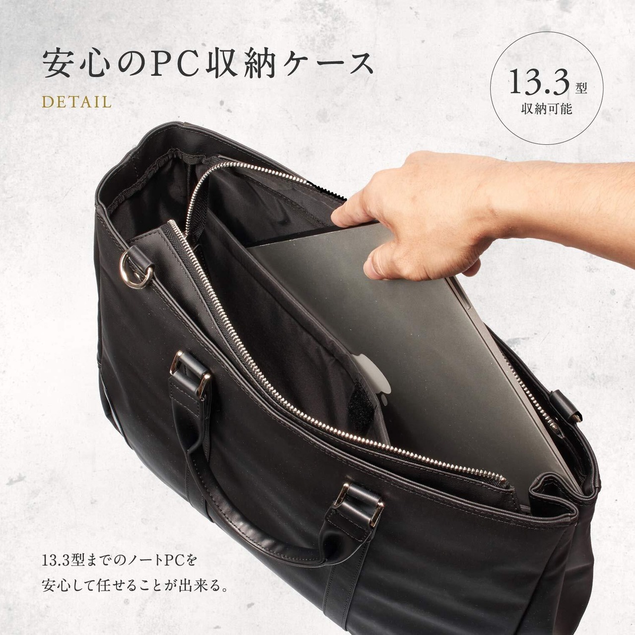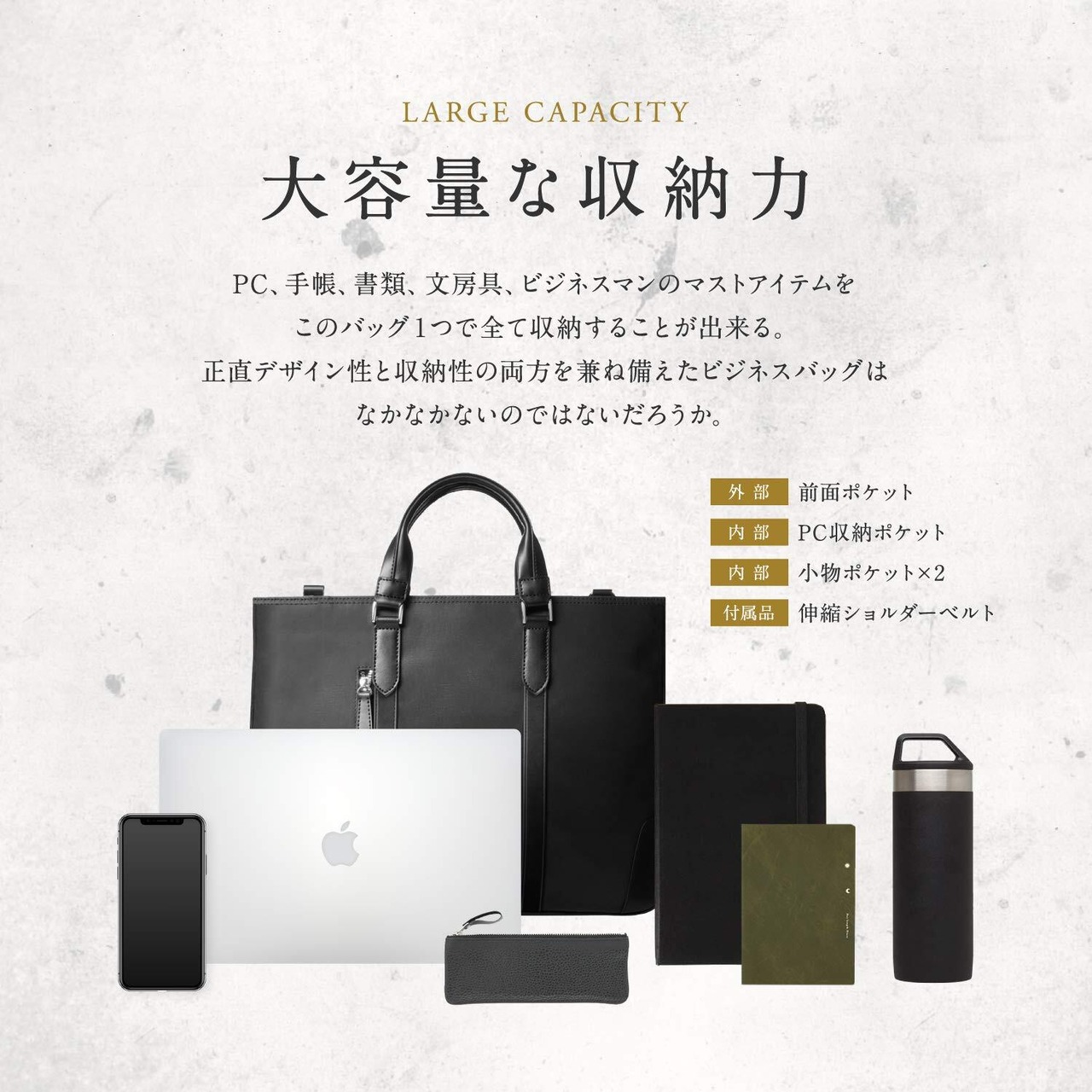 このビジネスバッグは、B4サイズの書類や14インチノートパソコンをスムーズに収納できる大容量設計が魅力です。内部にはPC収納ポケットや便利な前面ポケットも搭載しており、使い勝手の良さを実現しています。