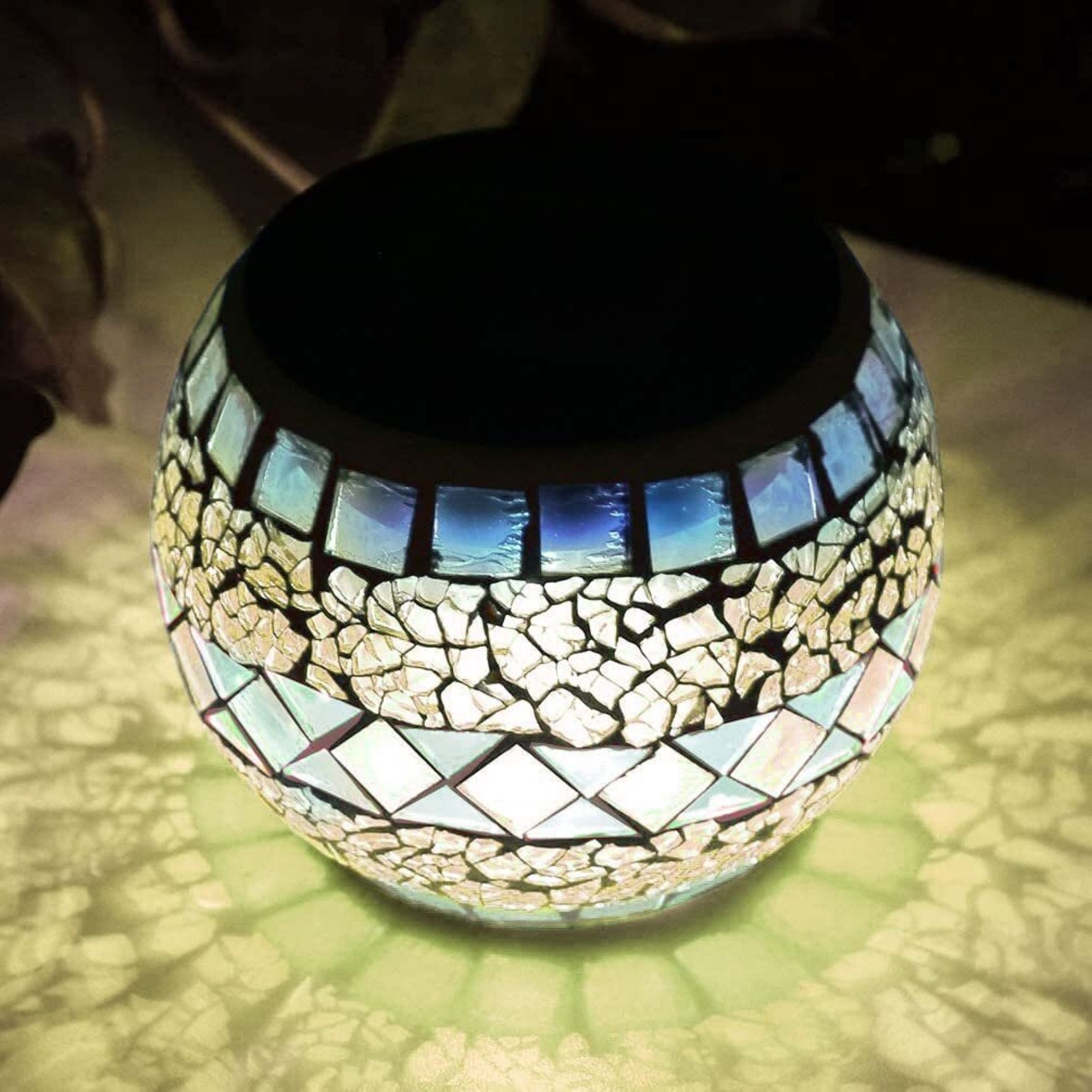 カラフルなモザイクガラスが特徴的なこのライトは、昼間はインテリアとしても美しく、夜は心癒される光の演出を楽しめます。どんな空間でもオシャレさを加えてくれます!