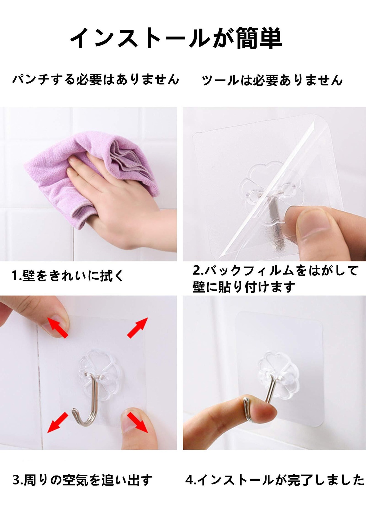 このフックは特別に設計された強力な粘着テープにより、簡単に取り付けることができます。穴を開けたり、壁を傷めることがなく、面倒な作業なしですぐに使えます。賃貸物件やお子様のいる家庭でも安心してご利用いただけます!