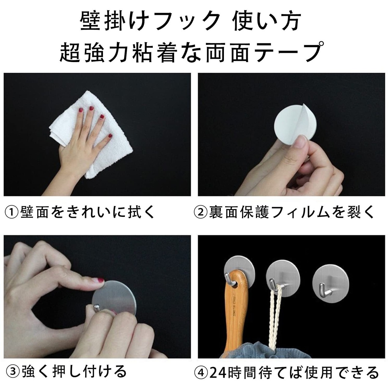 【取り付け・取り外しが簡単】裏面の保護フィルムをはがし、フックを壁に押し付けるだけ。貼り付けた後、24時間放置して、お気軽にお使いください。剥がすときは、テープの粘着剤をドライヤーで溶かすと簡単に剥がすことができます。