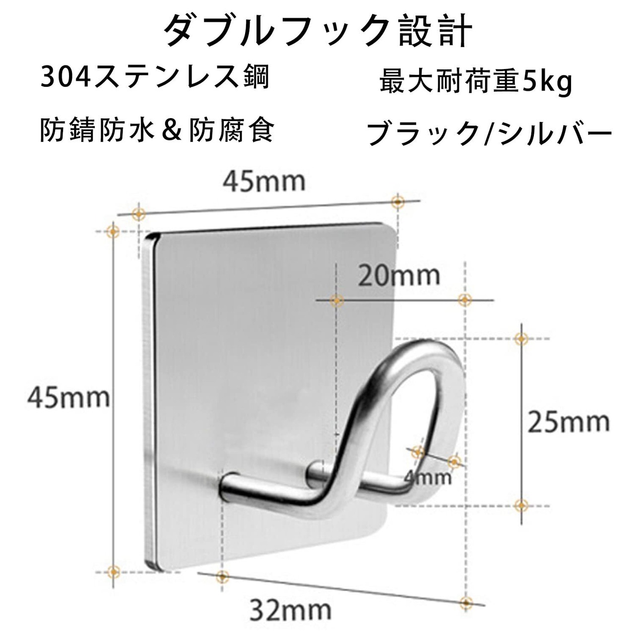 【錆びない、水に強い】高品質の304ステンレス鋼を使用しているため、この粘着フックは防水性と錆びにくさを備え、長い耐用年数があります。また、フックの角は滑らかで、衣類や手を傷つけることがありません。