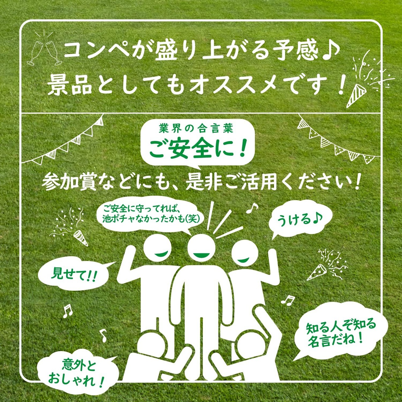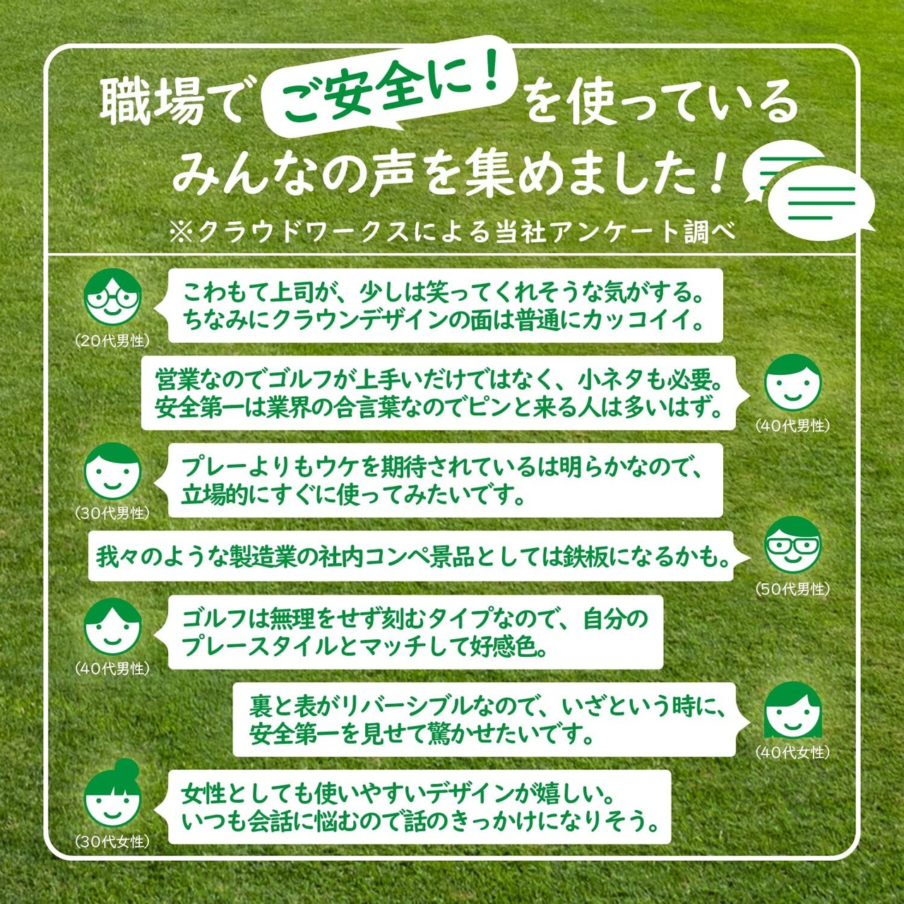 建設業や工場勤務の皆様にはもちろん、攻めずに安全なプレーを志すゴルファーの皆様にも愛されるデザインです。コンペの景品や参加賞、父の日やプレゼント、ギフトにも喜ばれるユニークなラウンドアイテムです。