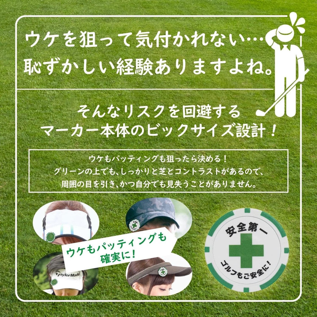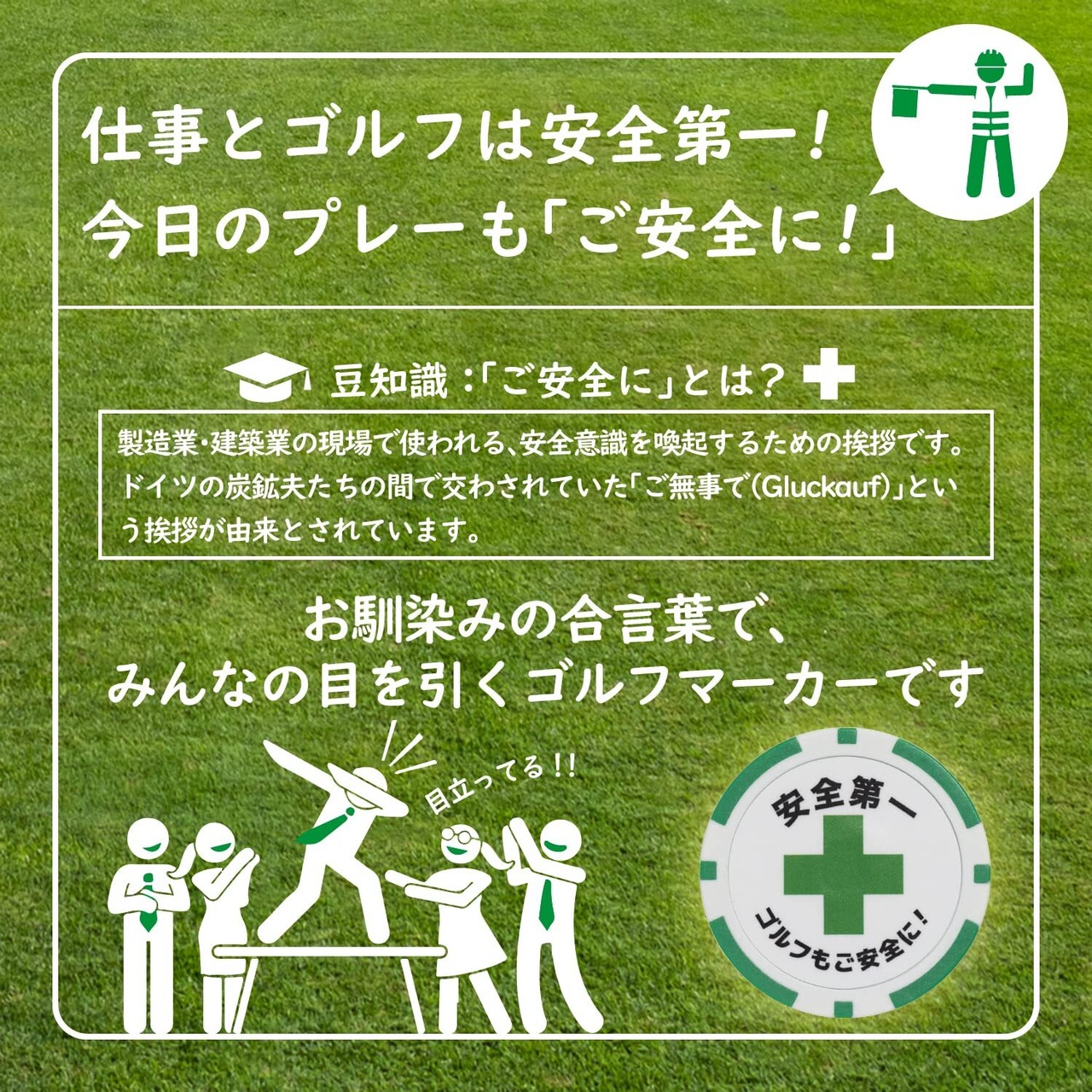 ラウンドが盛り上がるカジノチップ風のゴルフマーカー。「安全第一」という標語は業界でお馴染みのキーワード。ゴルフも仕事も「ご安全に!」という合言葉・挨拶で、コンペ仲間と笑いの絶えないコンペを楽しみましょう!