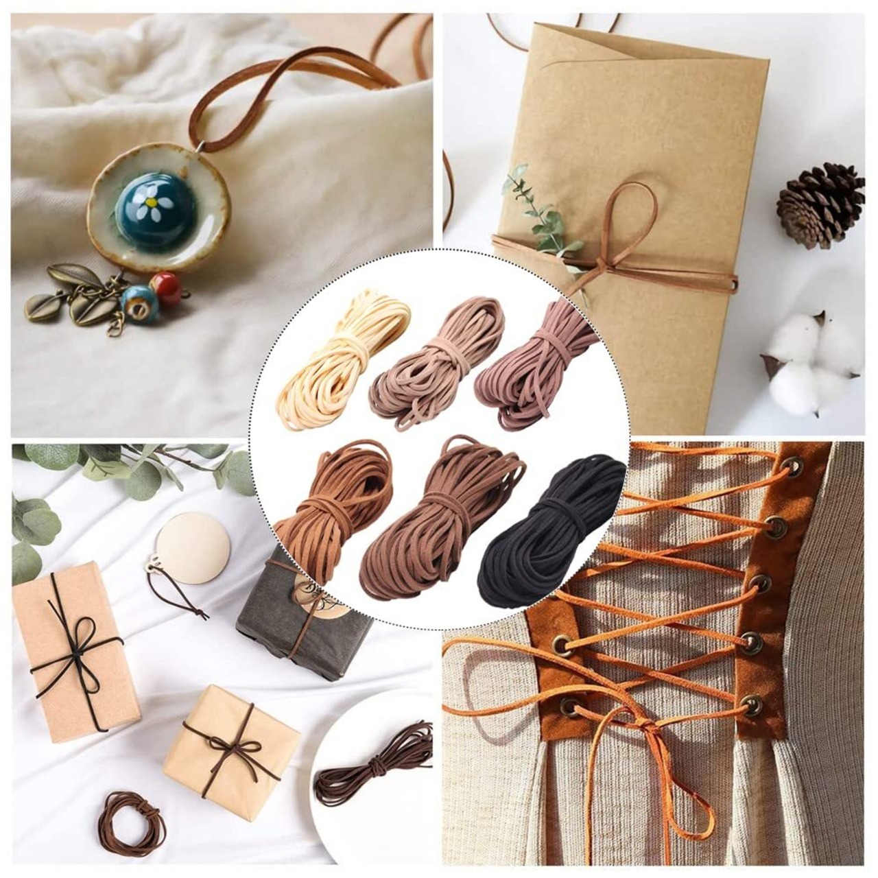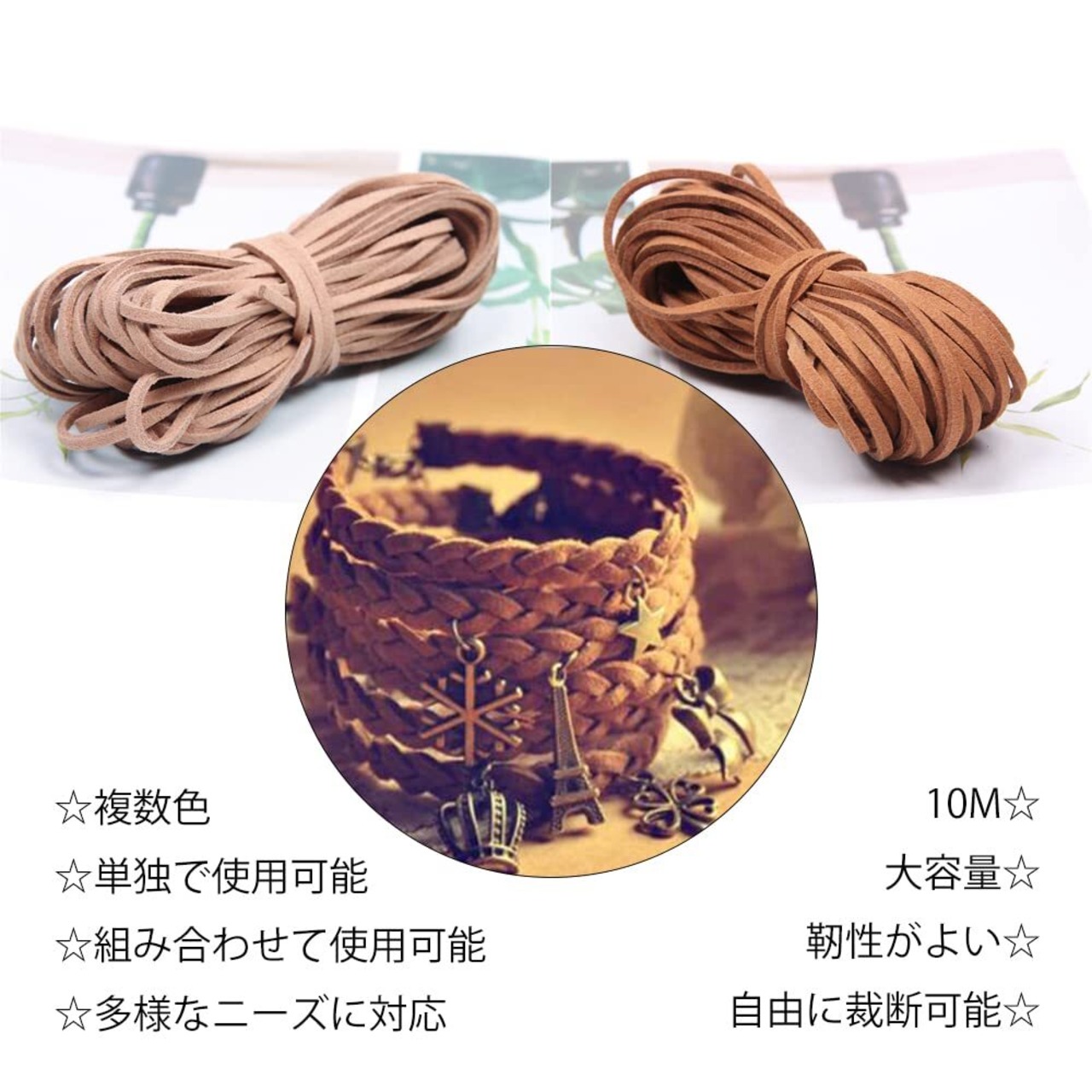 6色の美しいスエード革ひもがセットになっており、それぞれのカラーは個性を引き立てます。ネックレスやブレスレットはもちろん、様々なディテールに利用できるので、オリジナルの作品作りを楽しみましょう!