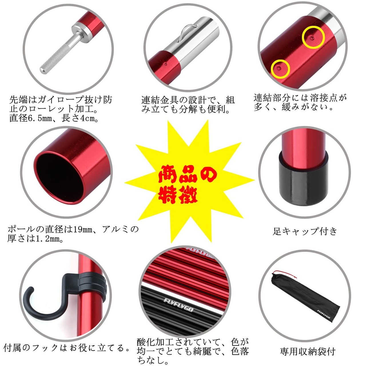 FLYFLYGO アルミテントポール タープポール 2本セット入り 直径19mm 分割式 ジュラルミン ソロキャンプ サブポール ツーリング コンパクト 収納ケース付き