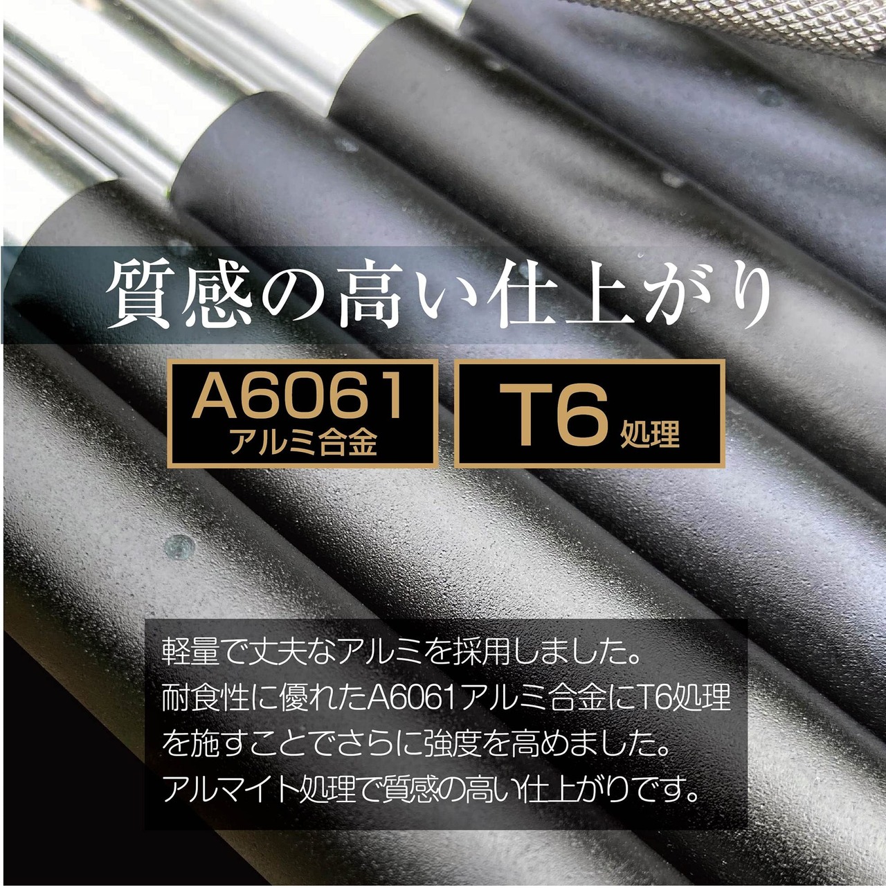 【A6061アルミ合金T6処理加工】耐食性に優れたA6061アルミ合金にT6処理を行い強度をアップしております。耐久性があり、錆などにも強い加工ですので、長くご使用頂けます。
