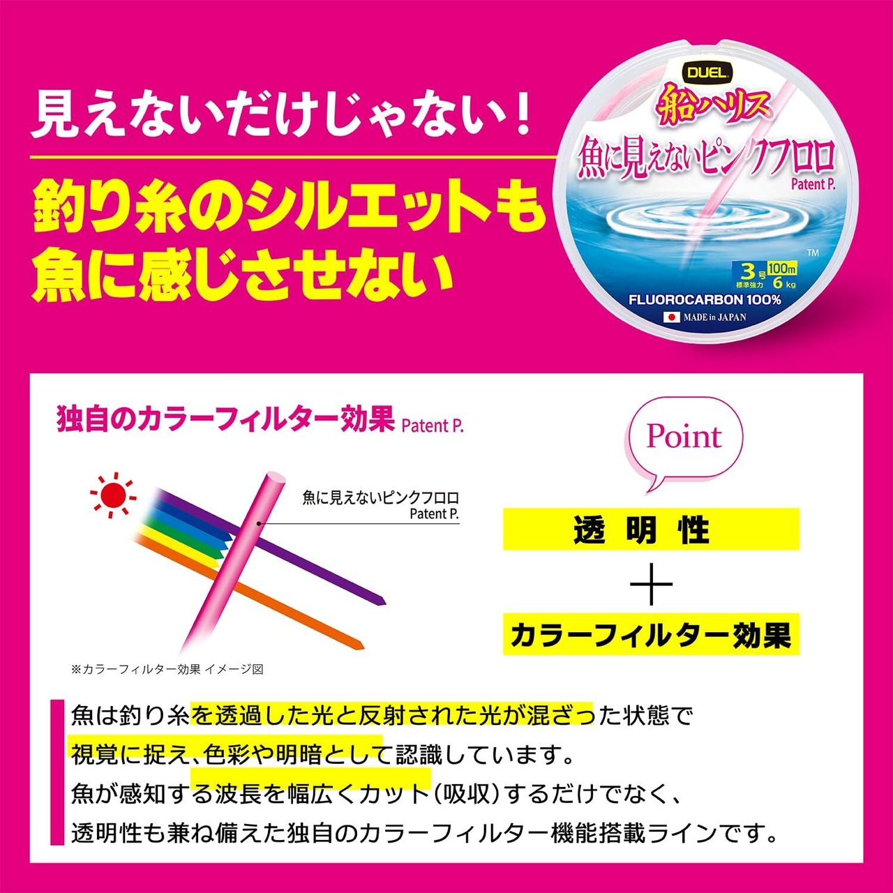 ◆人に見やすく魚に見えにくい「ステルスピンク」採用、一般的なピンクラインよりも幅広く”魚に見えない色相領域”をカバー