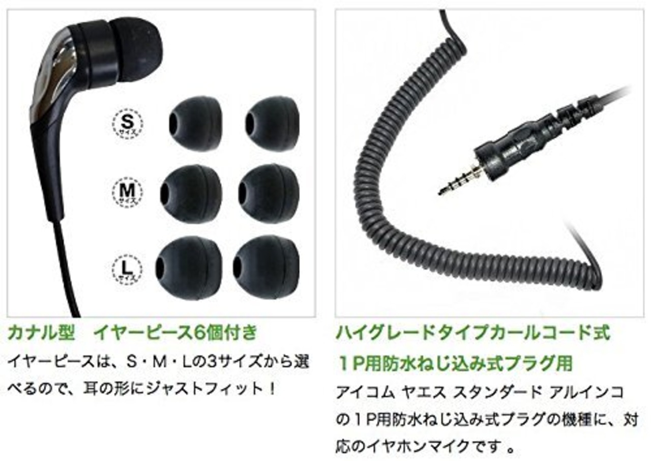 スタンダード アルインコ アイコム ヤエス用の1ピン防水ねじ込み式プラグの機種に対応のハイグレードカールコード式のカナル型イヤホンマイクです