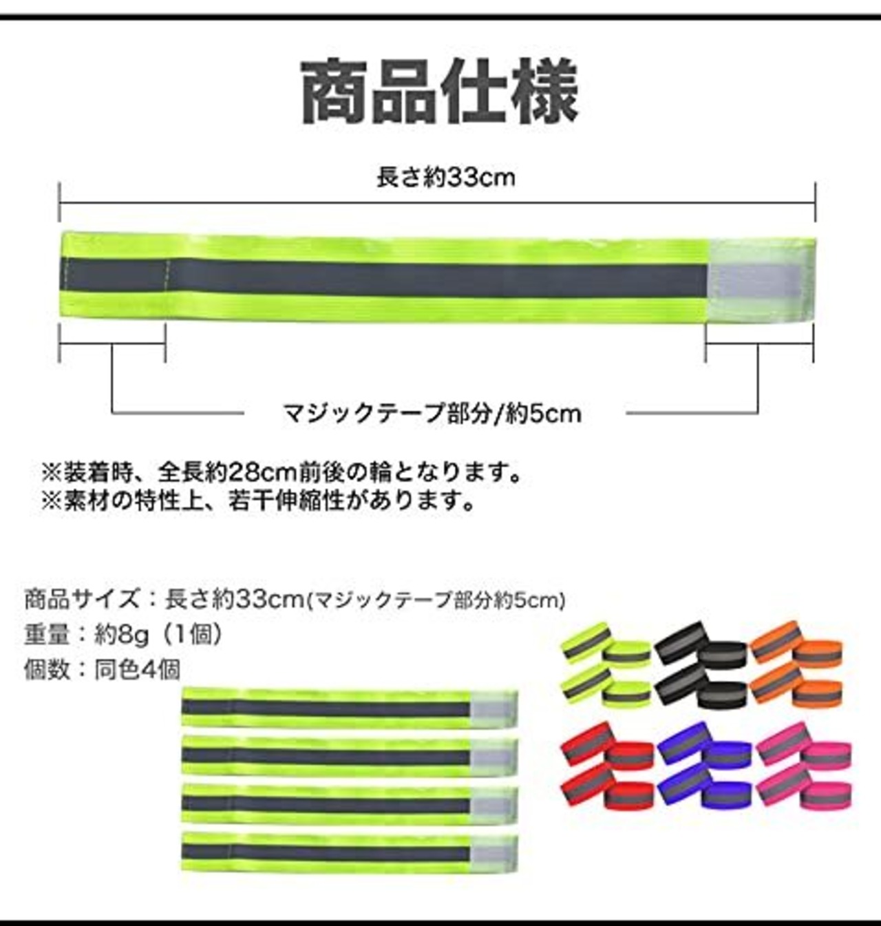 反射素材を使用したバンドは、夜間でもしっかりと光を反射し、自分の存在を周囲に知らせます。これにより、車や自転車との接触のリスクを減らし、安全に活動ができます。