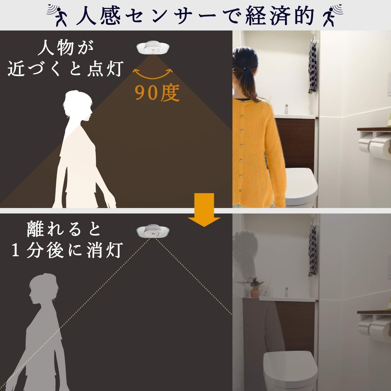 【人感センサー+照度センサー】感知距離:3m、感知角度:90度、消灯までの時間:1分、センサー動作周囲明るさ:50lx