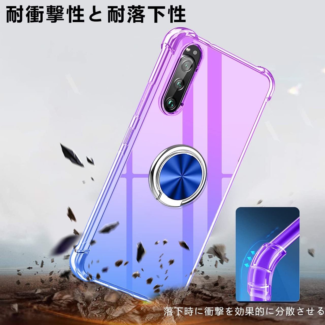【特価商品】Xperia 5 II ケース リング付き クリア 薄型 グラデーション色 ケース 軽量 tpu 耐衝撃 SO-52A SOG02 スマホケース 透明 米軍MIL規格取得 おしゃれ 黄変防止防塵一体型 人気 車載ホルダー ソニー エクスペリア 5 II 携帯カバー パープルブルー MD-SXZH-02-02