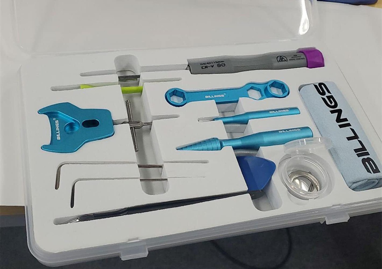 包装内容明細書: 1. タオル 2. 耐磁性リング 3. ノブのネジ取り外しツール(プラスチック) 4. ナット六角レンチ 5. +/- ドライバー 6. ピンセット 7. 2.0mm 内部六角レンチ 8. 1.5mm 内部六角レンチ 9. ベアリング用クリーンスティック 10. ファインヘッドチューブ 11. スプールベアリングリムーバー 12. ブラシ 13. パーツボックス(6ピン入り)
