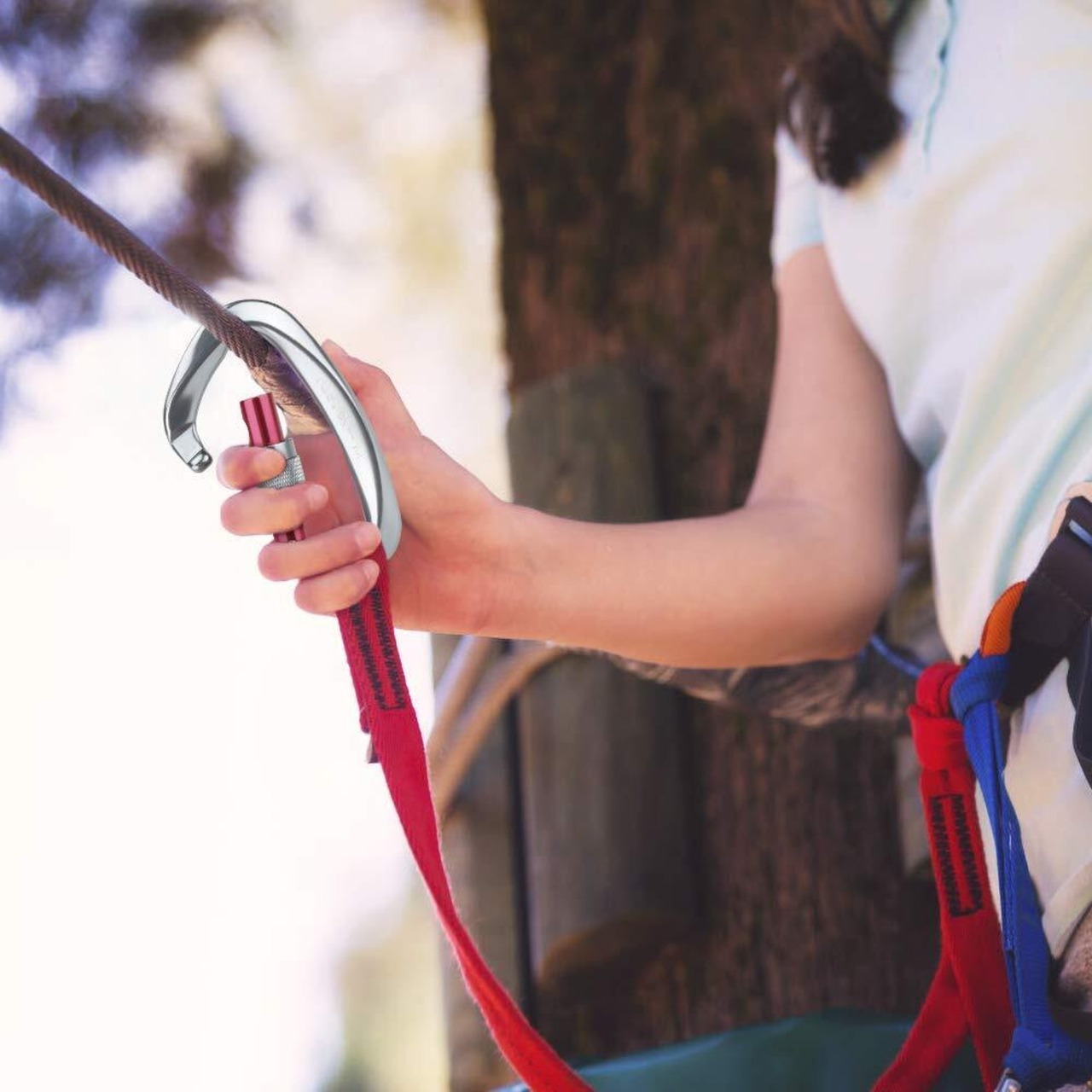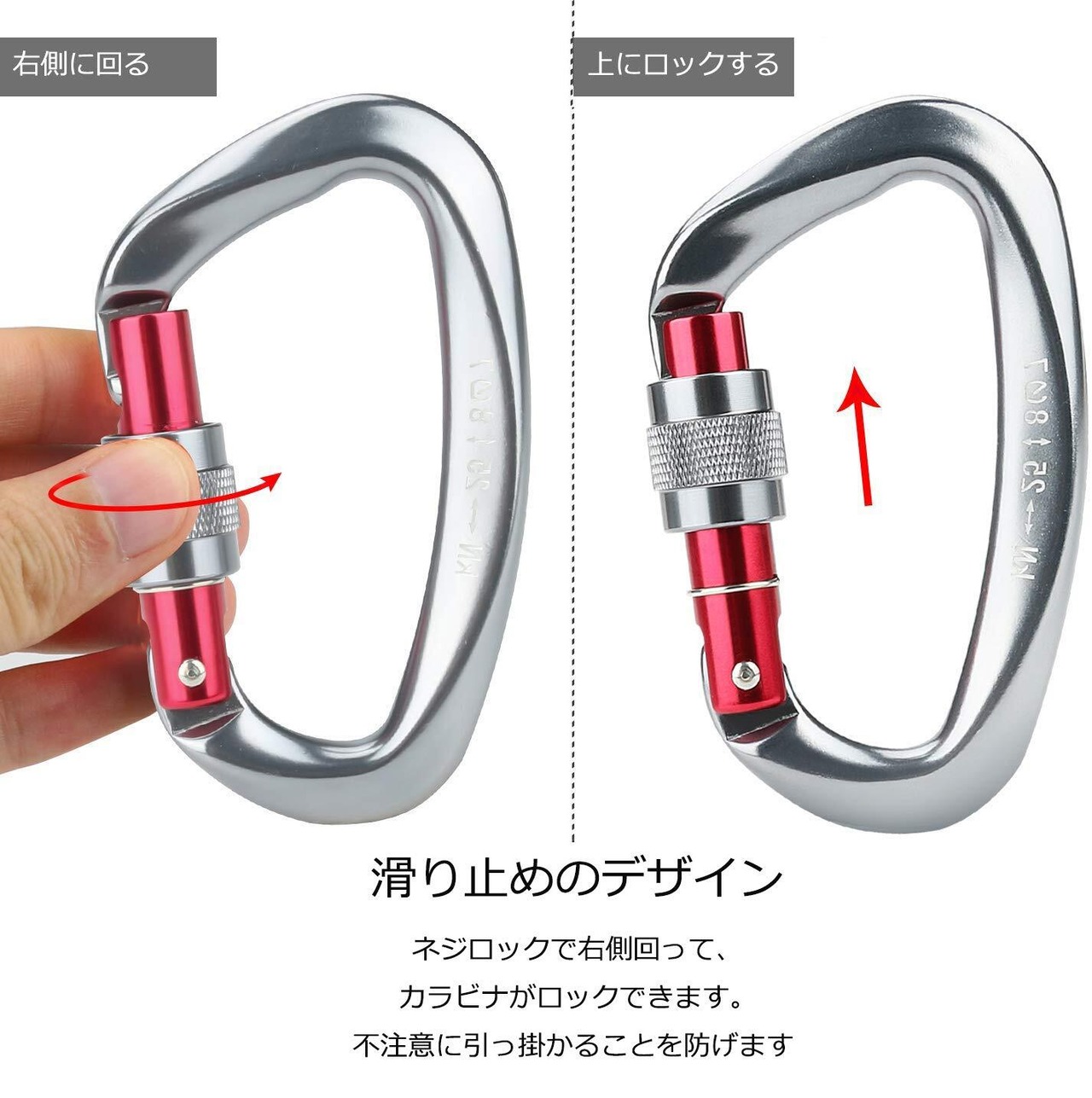 【優れた設計】D型デザインの登山釦が滑り止めと荷重を縦方向に集中させる機能があります。作業時、ネジロックで右側回って、カラビナがロックできます。誤って引っ掛かることを防げます