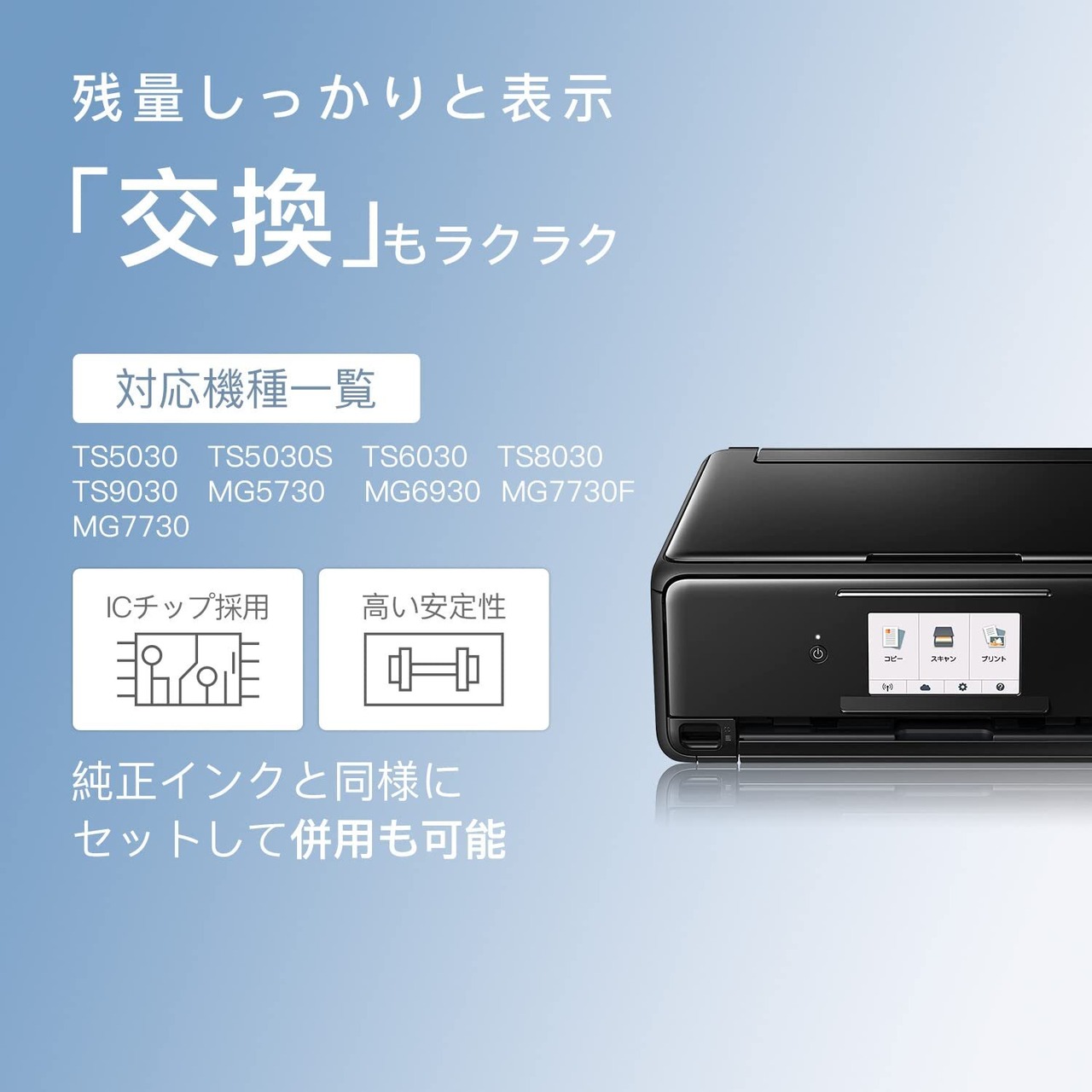 本インクは、Canon TS5030、TS5030S、MG5730、TS6030、MG6930、MG7730、MG7730F、TS8030、TS9030など、幅広いキャノンプリンターに対応しています。簡単に取り替えができ、すぐに印刷を開始できます。