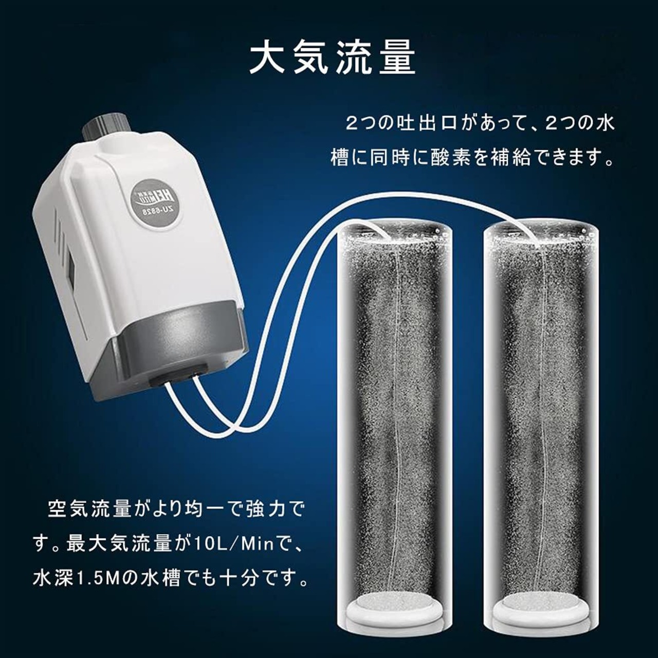 【新着商品】水槽用エアポンプ 2つ吐出口 小型エアーポンプ 空気ポンプ 酸素ポンプ 静音低騒音 酸素補給 エア量調節可能 省エネ 防振 設置簡単 コンパクト 強いパワー6W 大気流量2*5L/Min