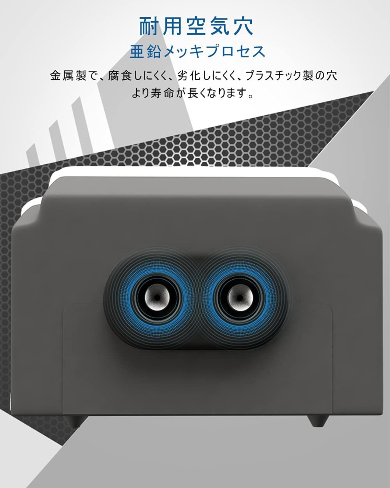 2つの吐出口があるため、大きな水槽にも対応可能。最適なエア量に調節でき、魚たちにとって最良の環境を提供します。酸素不足を気にせず、安心して水槽を楽しむことができます。