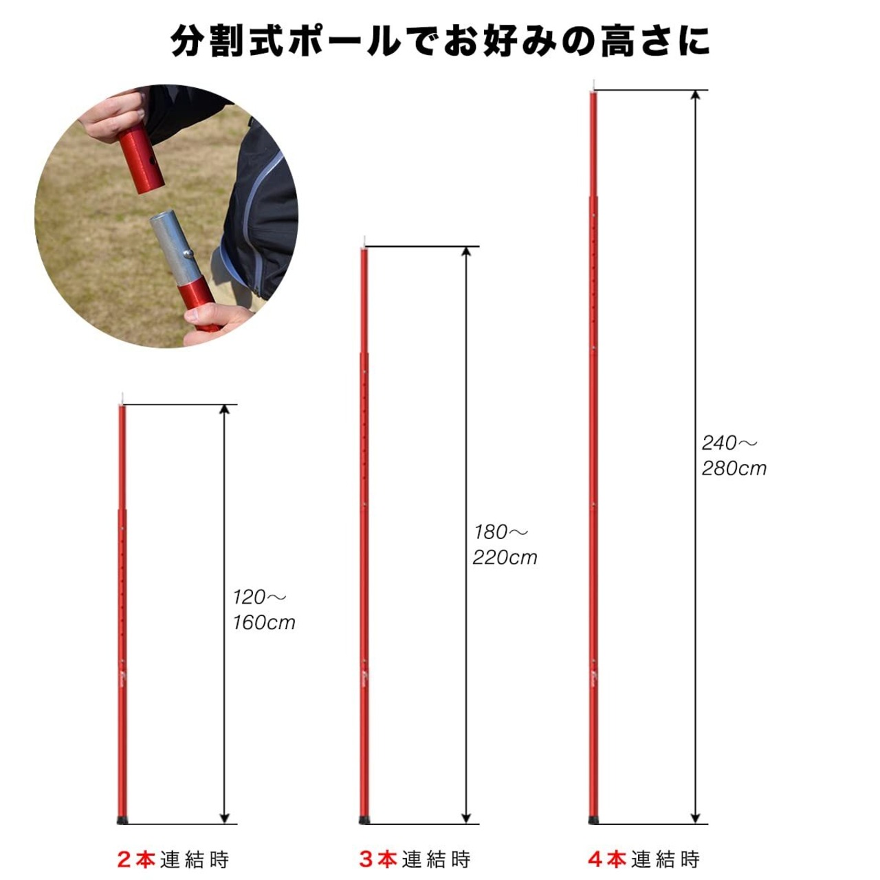 4本のポールを連結することで、より安定した使用が可能です。風が強い日でも安心して使用でき、快適なアウトドア体験をサポートします。