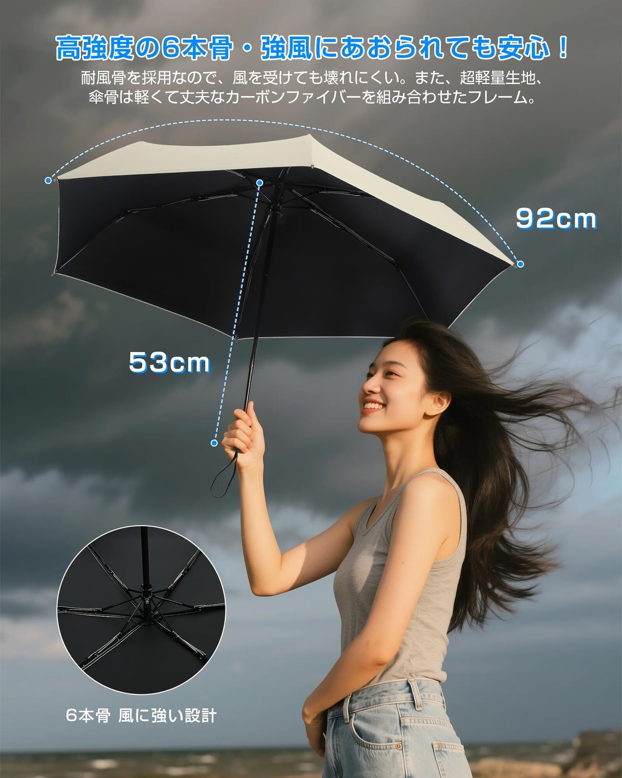 【折りたたみ傘】折りたたみ式傘は柔軟性と強度を併せ持つ繊維材料を採用しており、強度に優れた6本骨組みの設計で耐風性とコンパクトともに向上させた!強い風にあおられても折れたり曲がったりしにくいし、万が一吹かれて折れにしても、裏返ってすぐ簡単に元に戾ります。