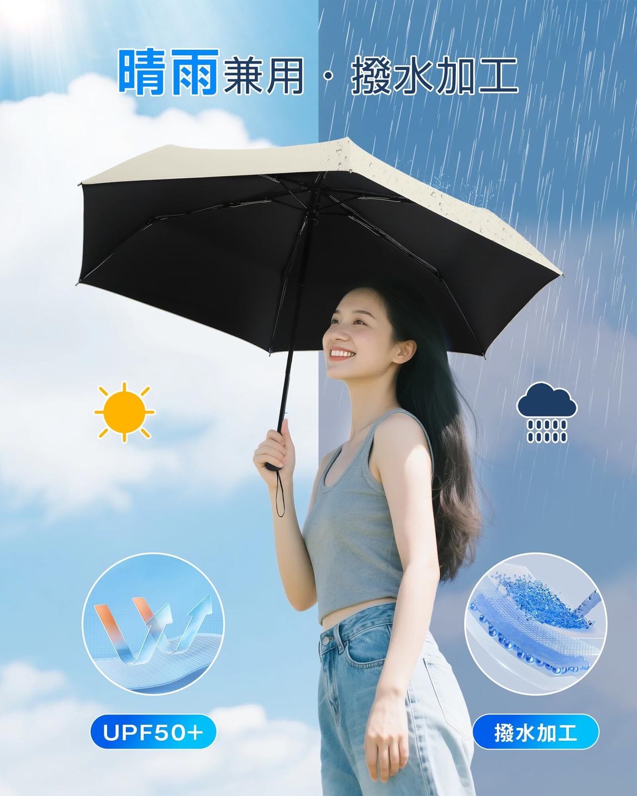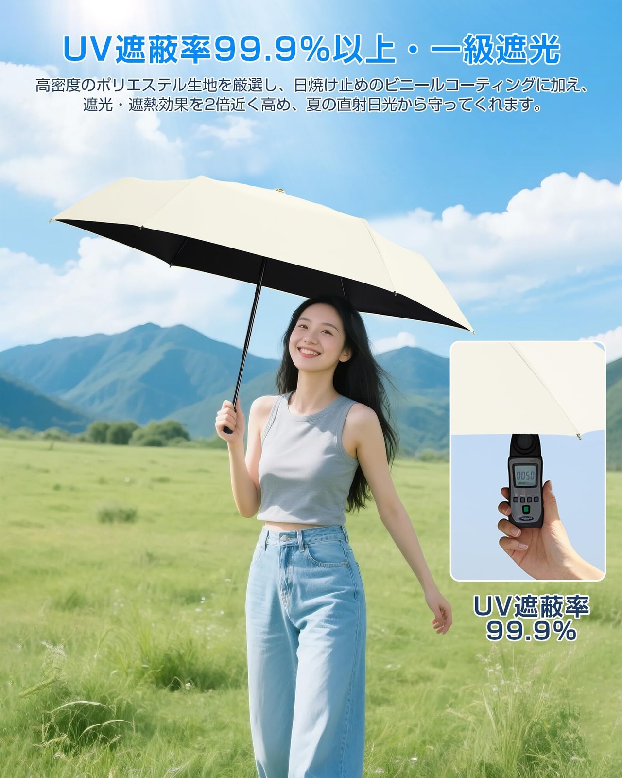 【晴雨兼用&UVカット】傘布に遮光遮熱コーティング加工を施し、紫外線を99%カットします、上から紫外線を遮断しながら、地面からの輻射熱を黒で吸収し、眩しさが軽減されています。なお、撥水性が高く、雨の日も安心。高密度キャロム布に高撥水テフロン加工が施され、しっかり水を弾きます。晴れている間は日傘、雨が降ってきたら雨傘として使用可能です。急に天候が変わっても安心できます。