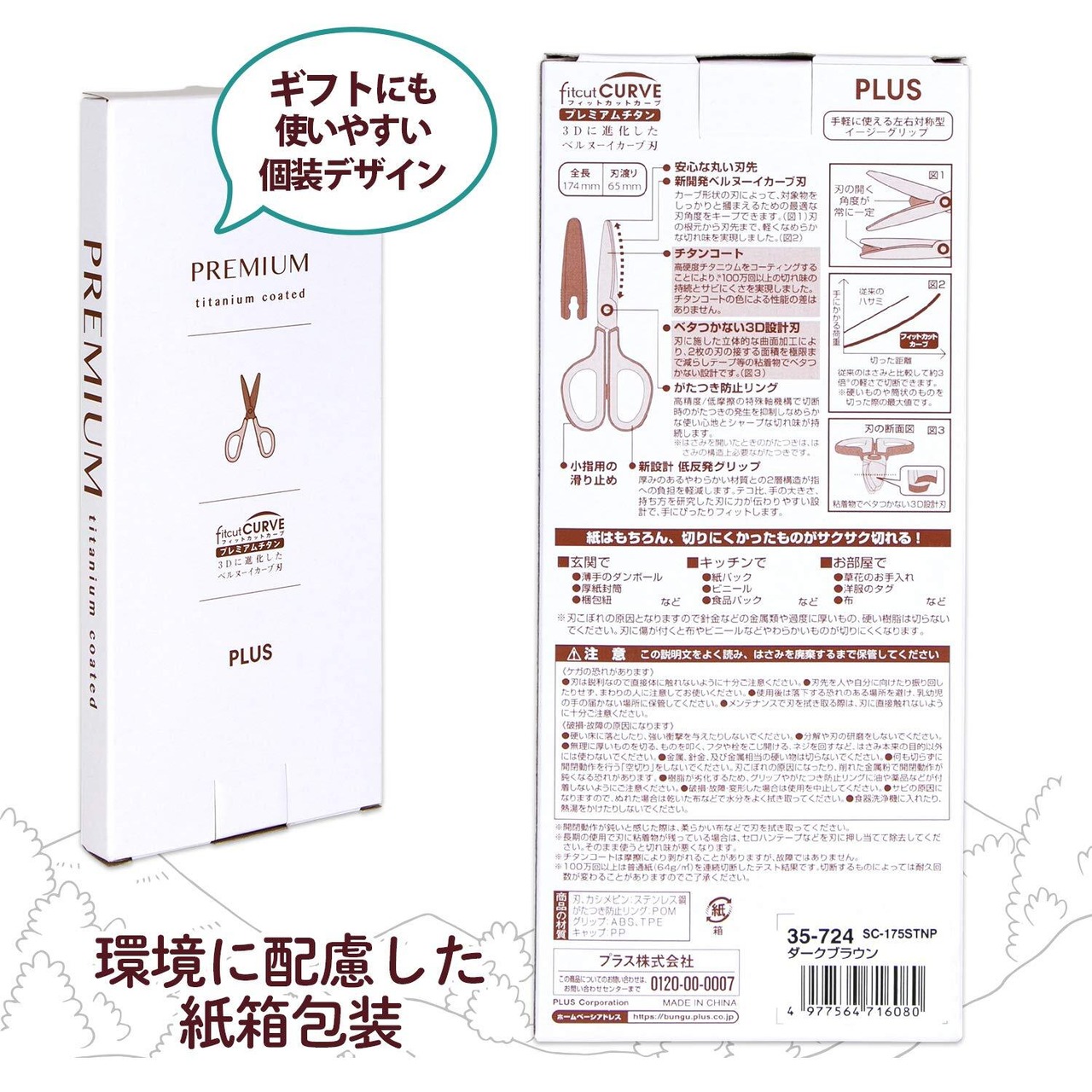 プラス はさみ 汚れ・サビに強い フィットカットカーブ プレミアムチタン ベタつかない 30度 切れ味継続加工 紙箱包装 ダークブラウン 35-724