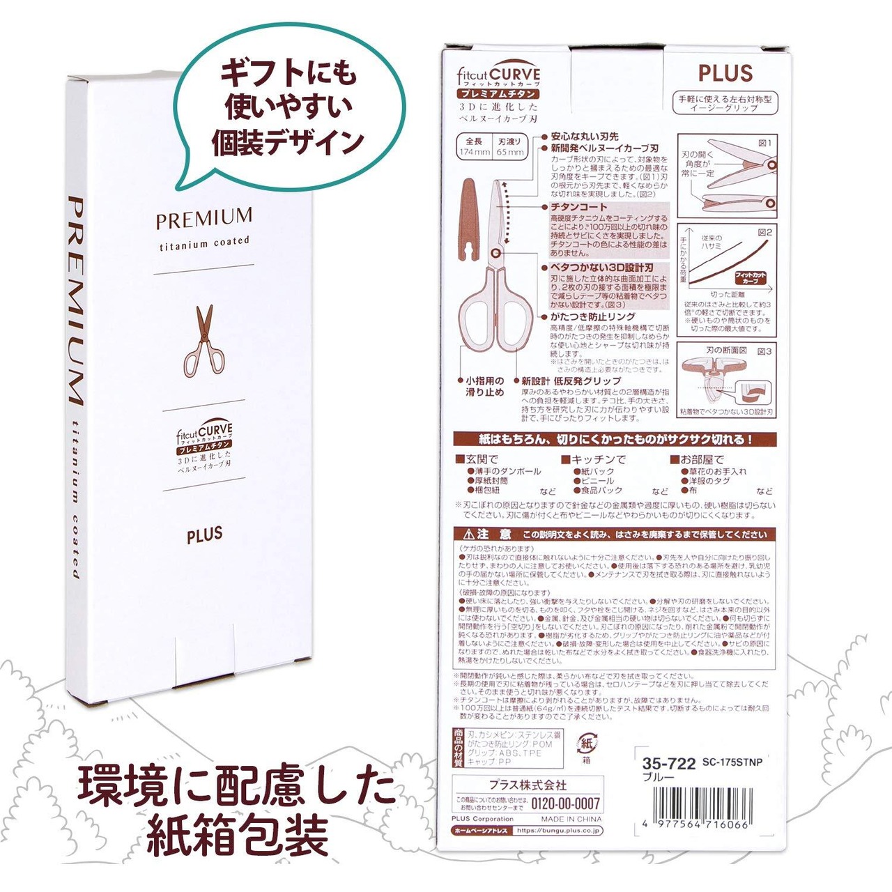 プラス はさみ 汚れ・サビに強い フィットカットカーブ プレミアムチタン ベタつかない 切れ味継続加工 紙箱包装 ブルー 35-722
