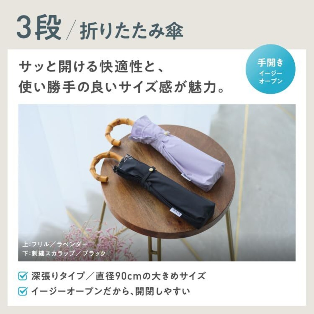 持ち運びに便利な3段タイプの折りたたみ傘