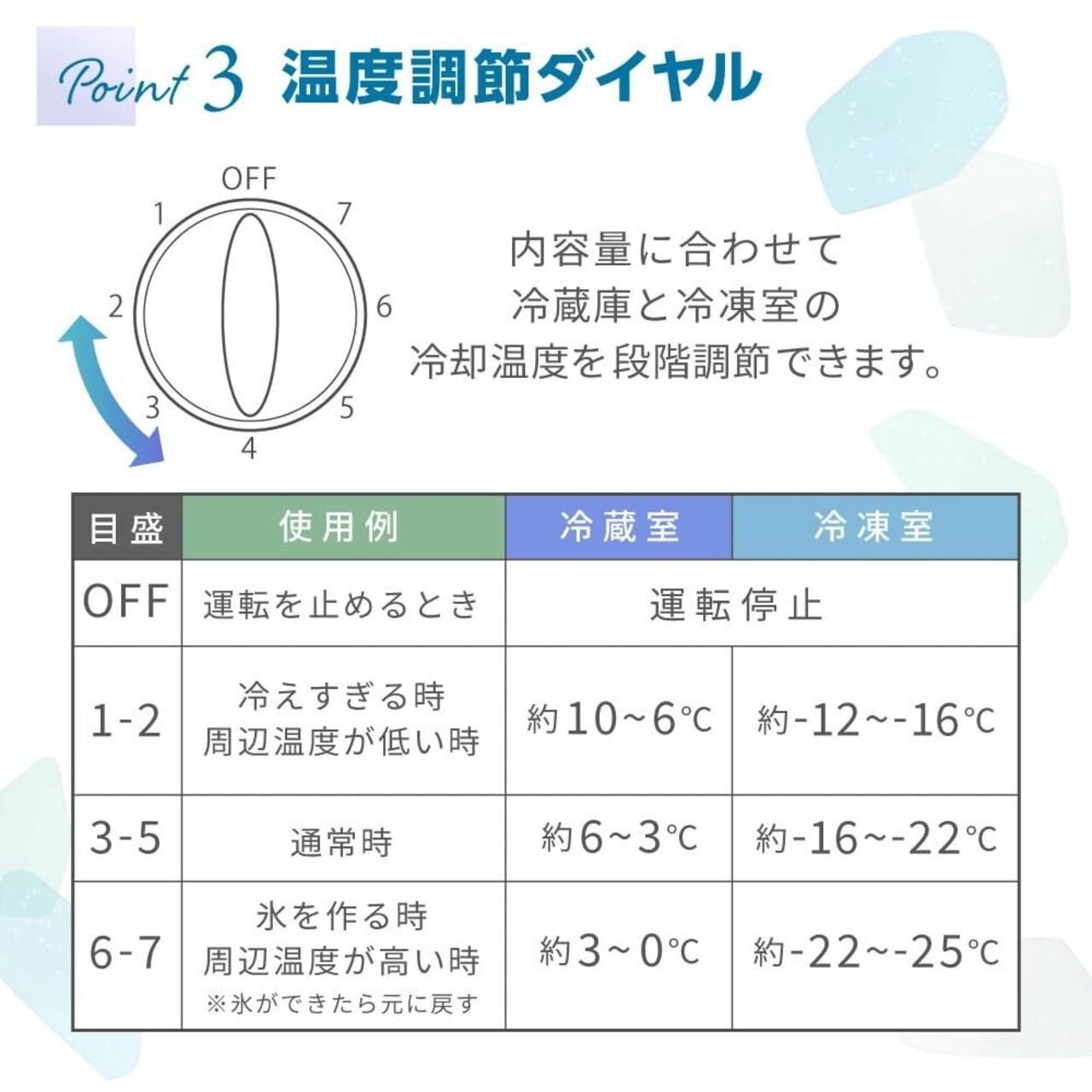 温度調節ダイヤル 内容量に合わせて冷蔵庫と冷凍室の冷却温度を段階調節できます。