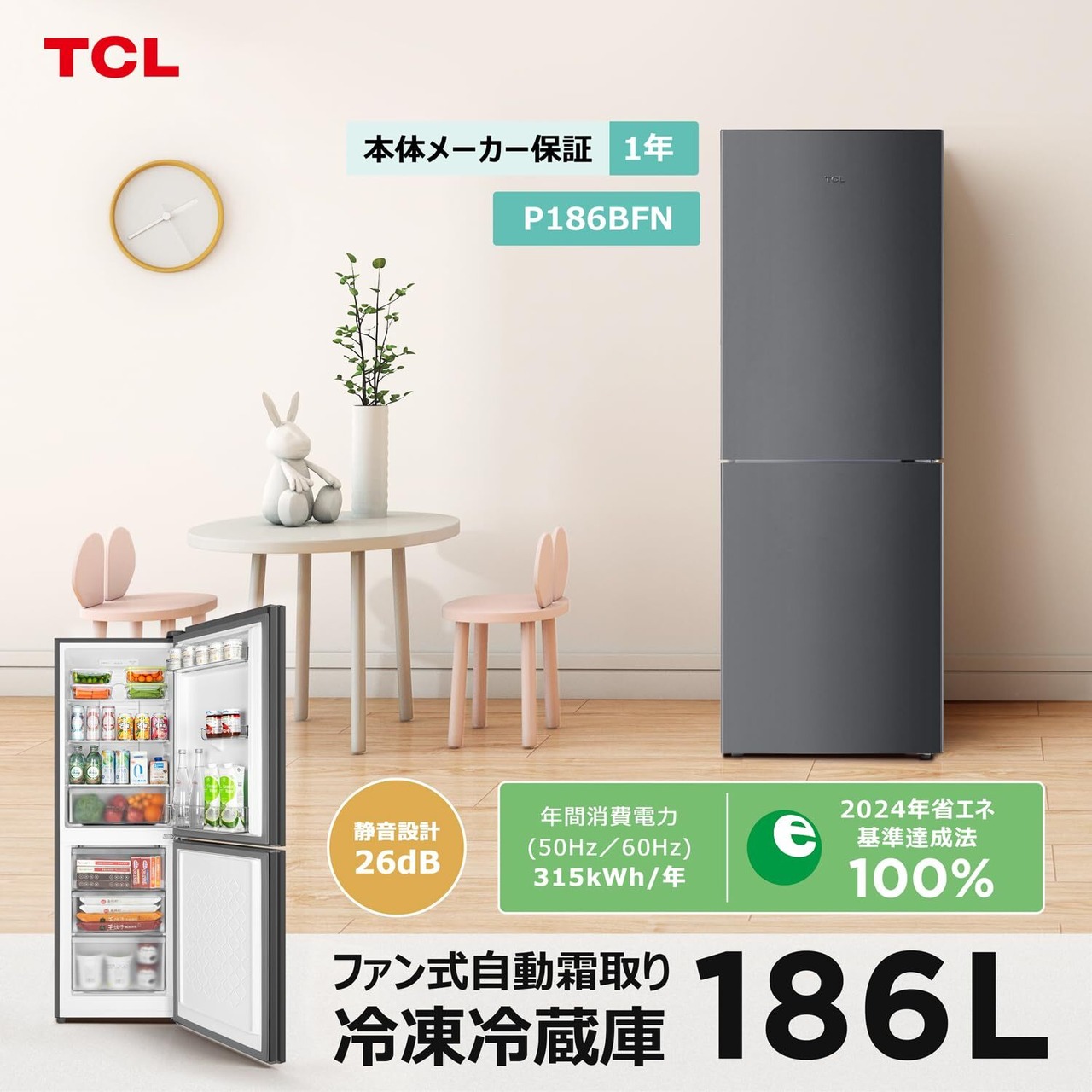 「理想のひとり暮らしを実現するための冷蔵庫!TCLのP186BFN。コンパクトでありながら、充実した機能を誇るこの冷蔵庫で、新たな生活をスタートしましょう!」この冷蔵庫は、洗練されたデザインと頼もしい性能を兼ね備えたアイテムです。